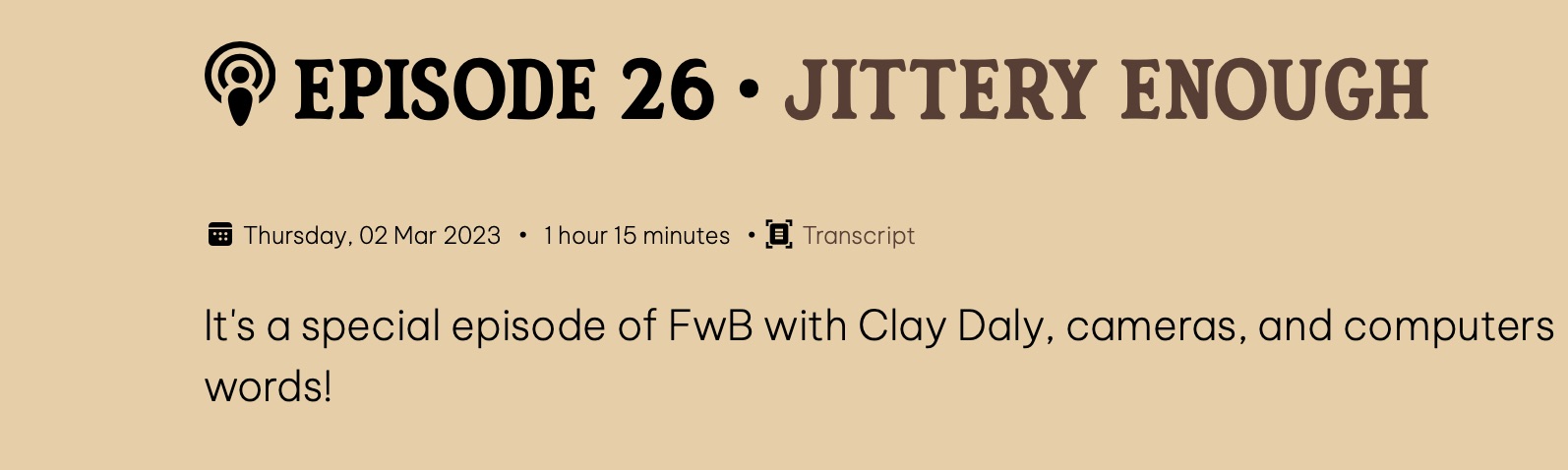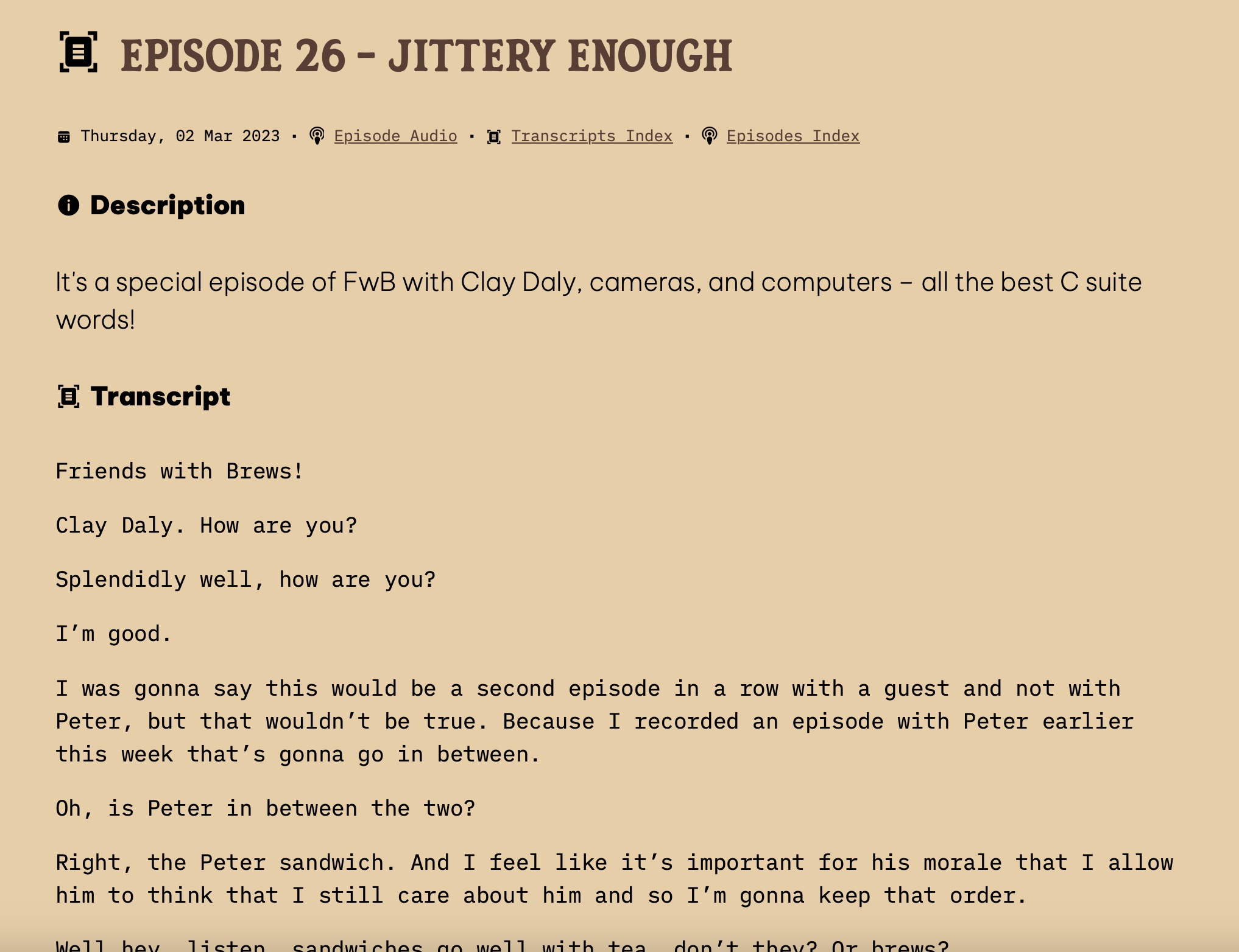 You’ll notice I said transcript functionality. I’m weasel-wording it a bit there because now I need to generate transcripts for all the episodes. So far I have them for episodes 1, 22, and 26 (the current podcast episode as of this writing).