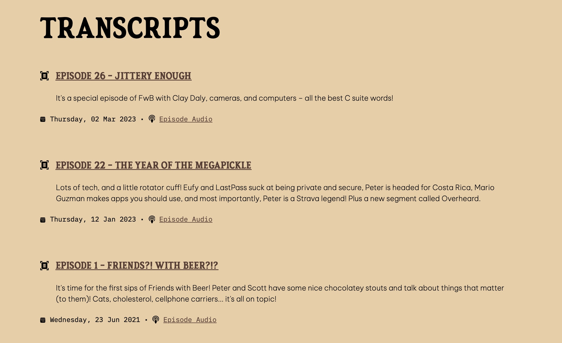 On the Friends with Brews homepage, click the Transcripts link under the podcast description paragraph, and you’ll see a list of available transcripts.
