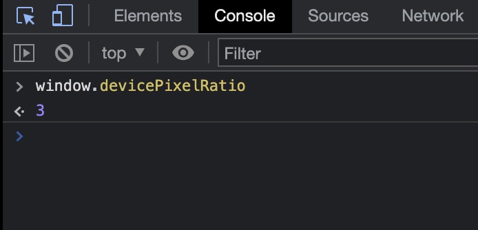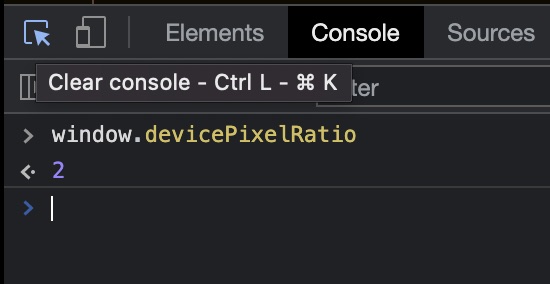 You can use the console in your browser developer tools to show you the pixel-ratio for your computer’s screen as well as any simulated devices in responsive mode. Below are the pixel-ratios for my 27” 5K iMac screen and the screen of the iPhone 12 Pro that I used for the above tests.