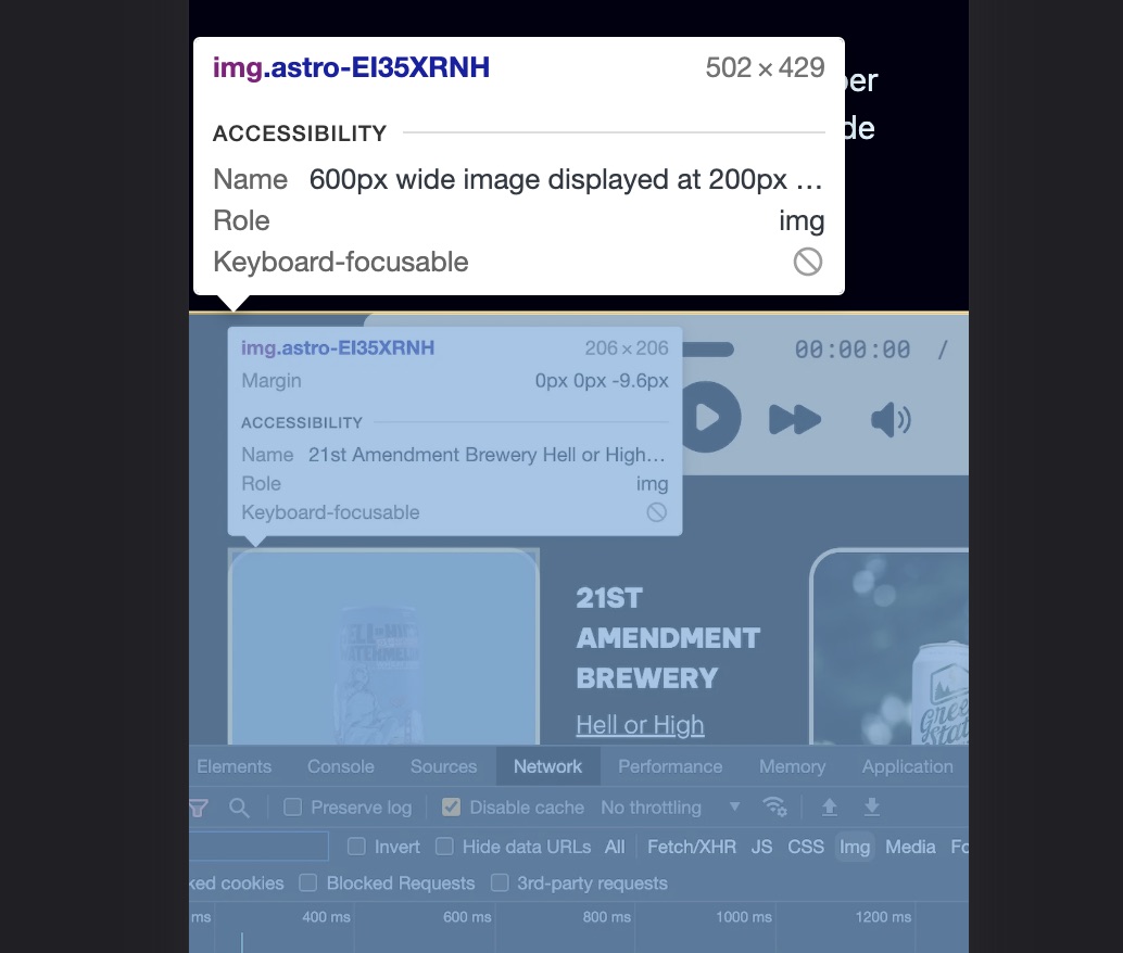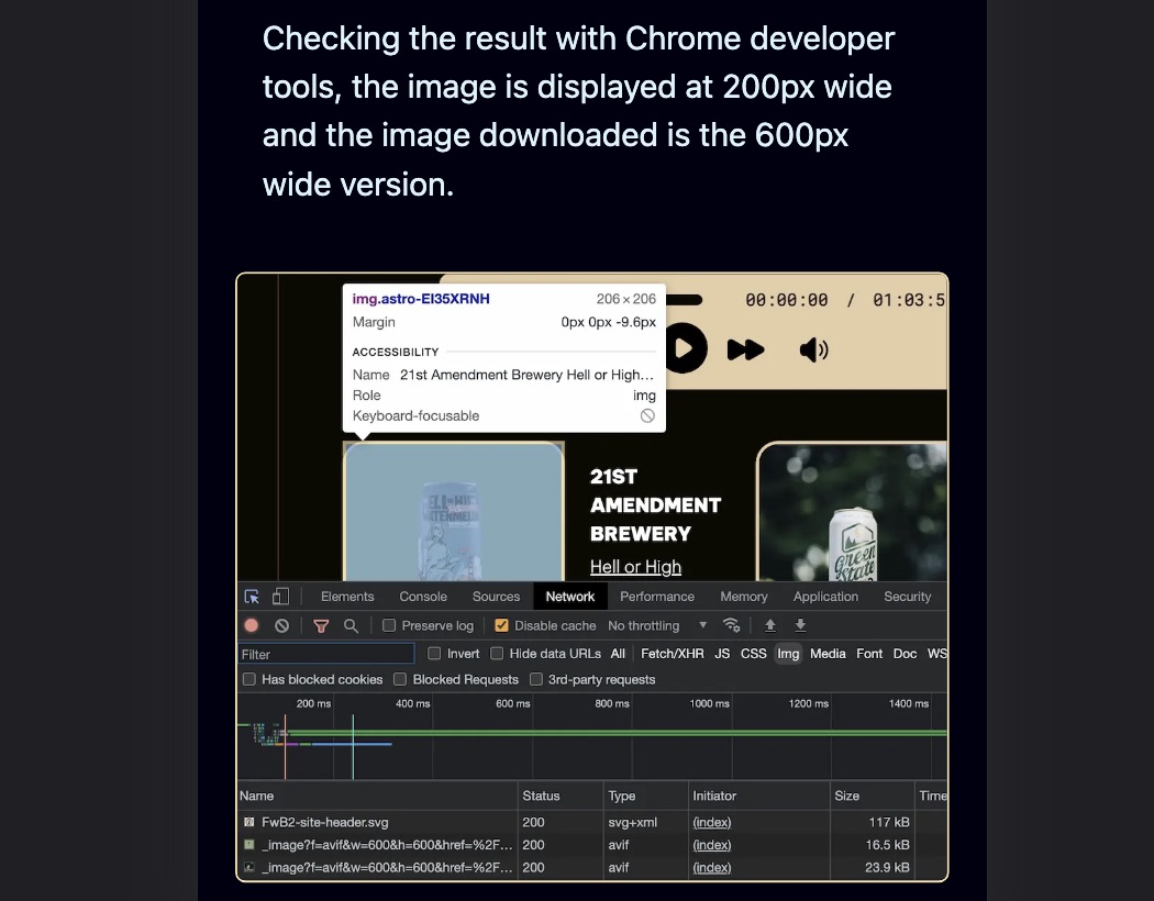 A couple days ago, I posted some responsive image and Astro Image science experiments. If you read that post, you’ll notice that my examples all assume I want to display my image at 200px wide. The reason is I was performing the experiments on a very specific layout that I use to show what beer we enjoyed on a given episode of Friends with Beer.1