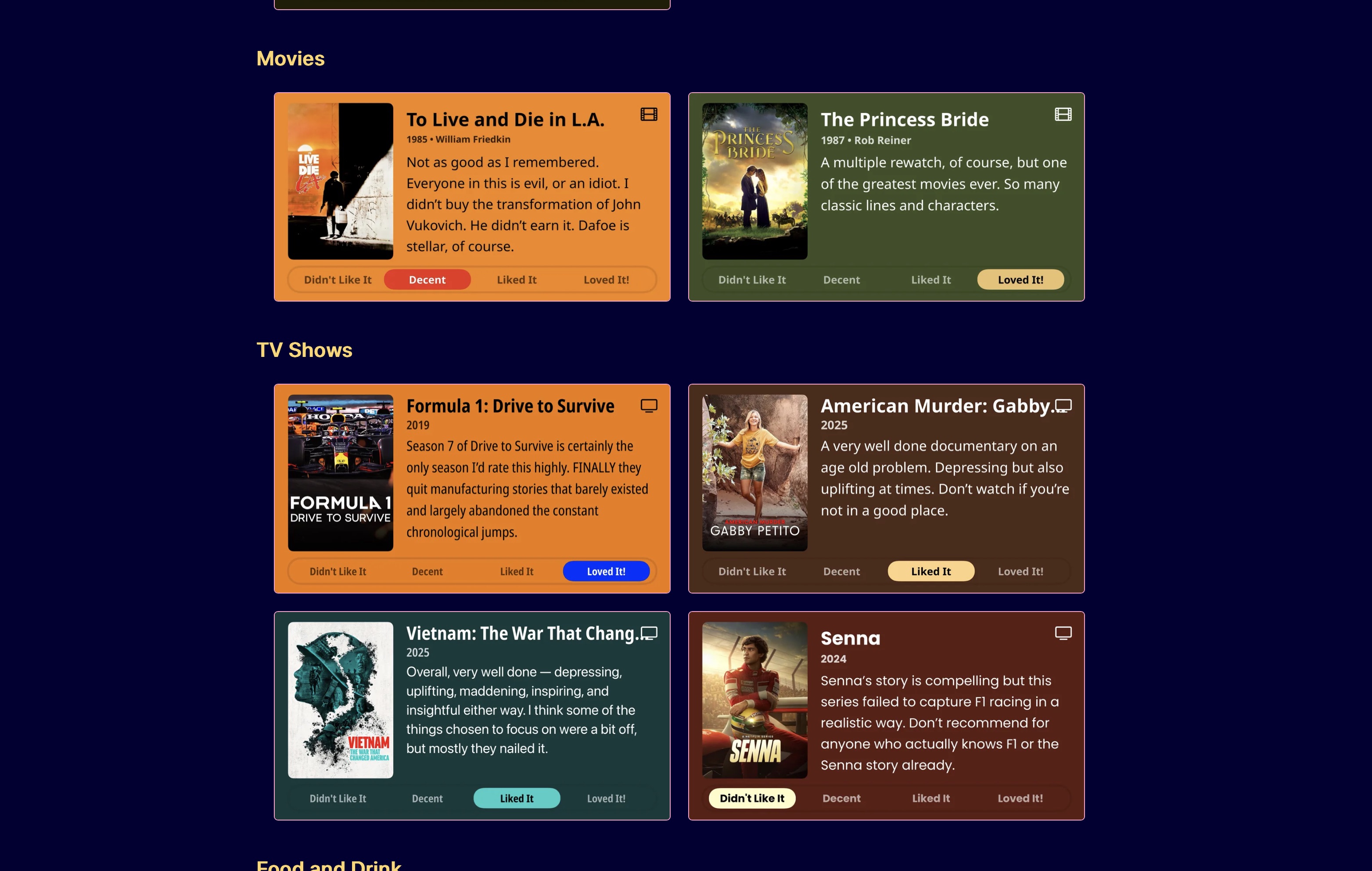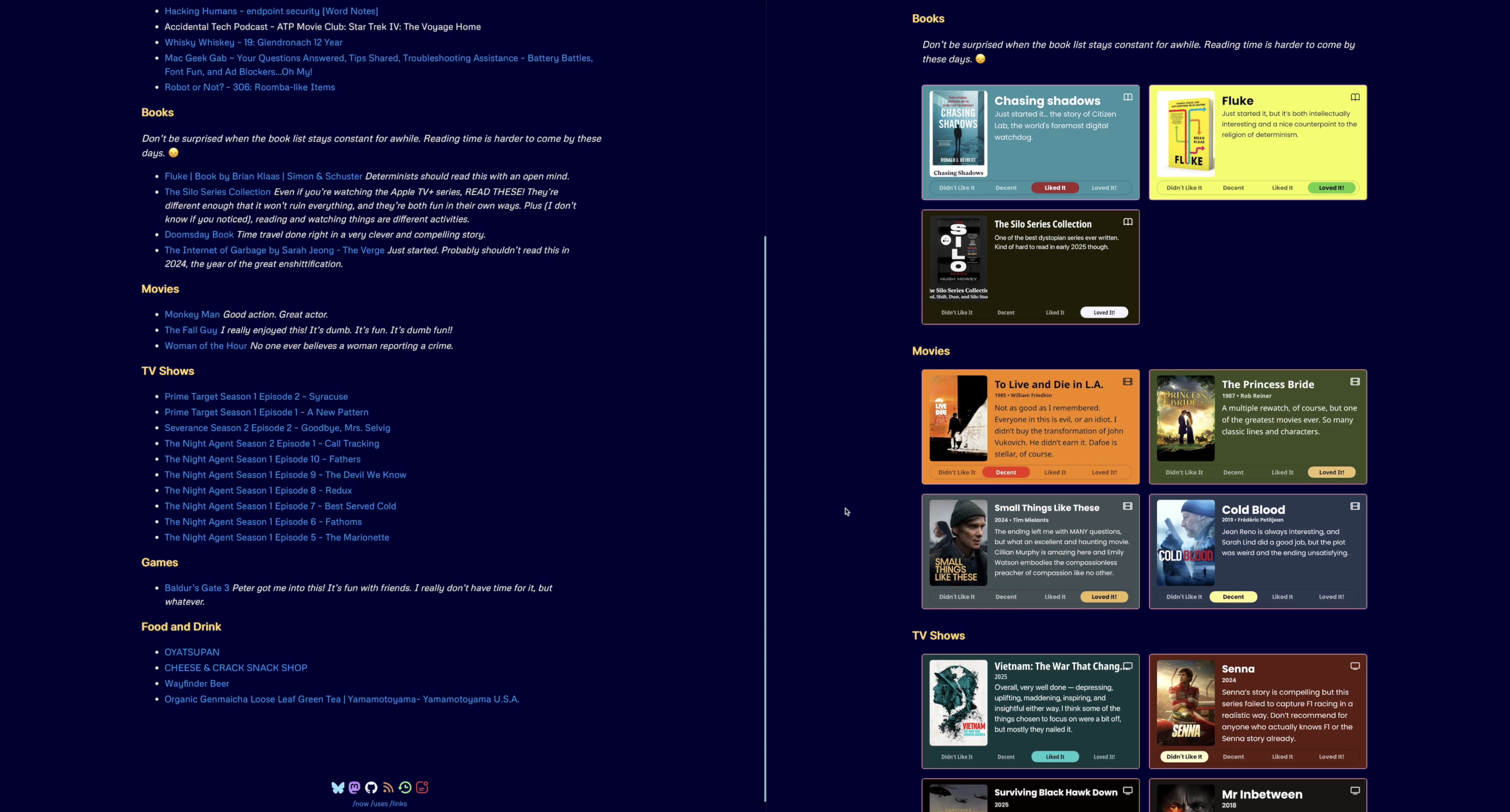 Initially everything on my now page was bullet lists of text links. This works, and it’s fine, but I also was a little envious of how nice some other people’s media logs looked with artwork for their movies and shows. I’m thinking of Robb Knight’s Almanac, Habib Cham’s Books page, and Cory Dransfeldt’s Music, Watching, and Currently Reading pages, for example.
