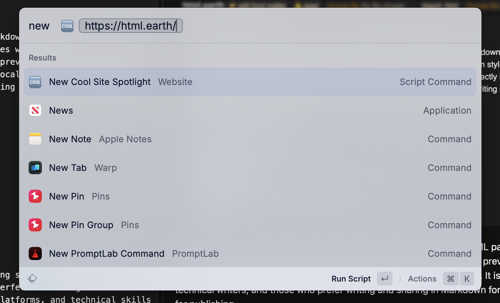 Here’s the full New Cool Site Spotlight Raycast script command: