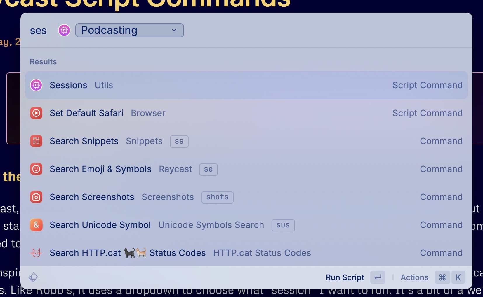 Raycast script commands can be written in bash script, Apple Script, Swift, Python, Ruby, or JavaScript (Node.js). This one is a bash script, and the Podcasting option very simply uses bash commands to run a bunch of other utilities: SwitchAudioSource, to set audio output and input, a Raycast custom window management command to open my podcast session apps and place their windows per a custom layout, a shortcut to toggle my desk lamps, and finally an inline Apple Script (osascript) to start an Amphetamine app session so the display can’t sleep.