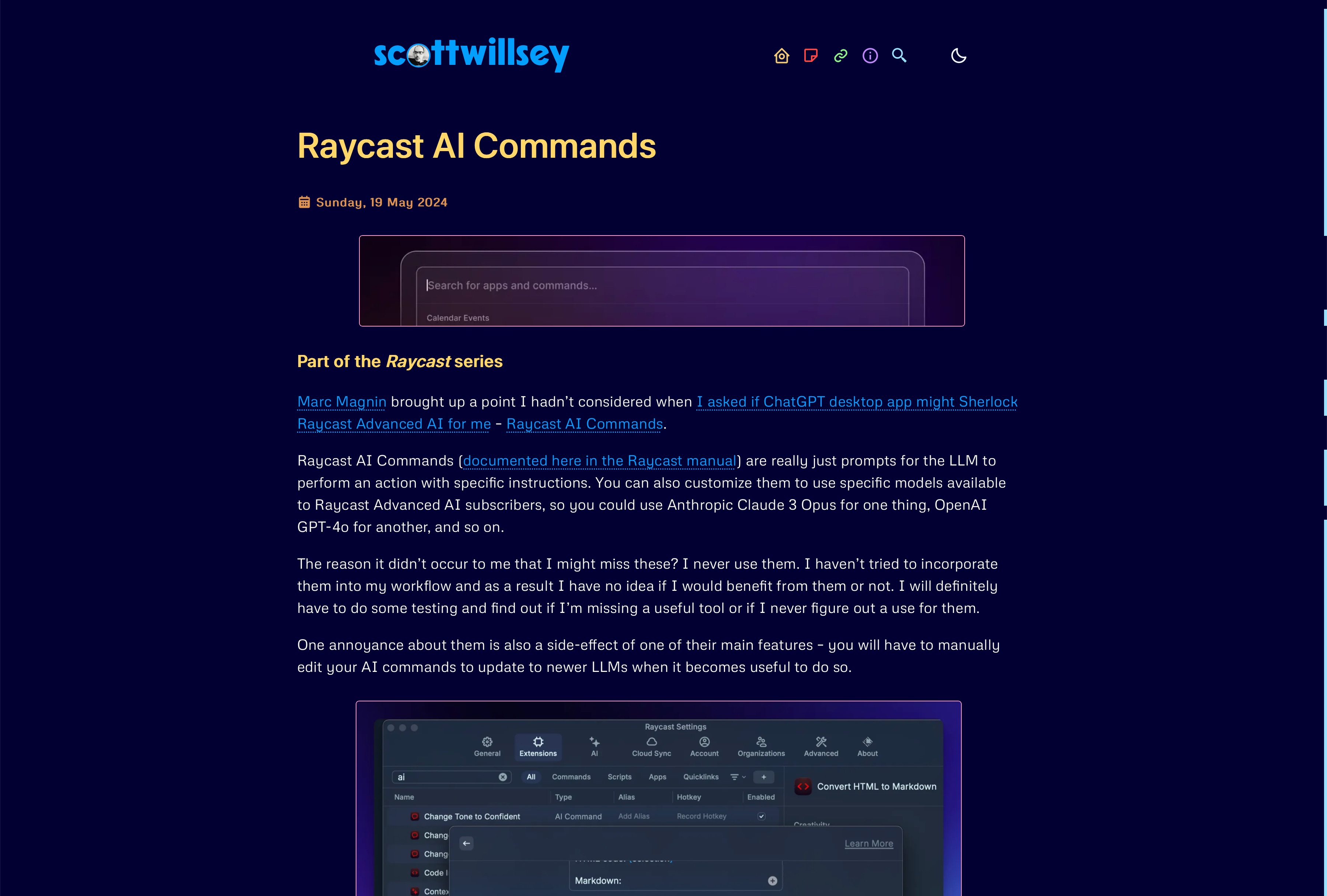 The nice thing is since my Script Command looks for the last updated blog post to modify, all I have to do is paste and save in VSCode, and then run my Script Command. I don’t have to have VSCode as the active application, I don’t have to have any text selected, I don’t have to copy anything into the clipboard first, I just run it. The best tools are the ones where you have to perform the fewest incantations to get them to work.
