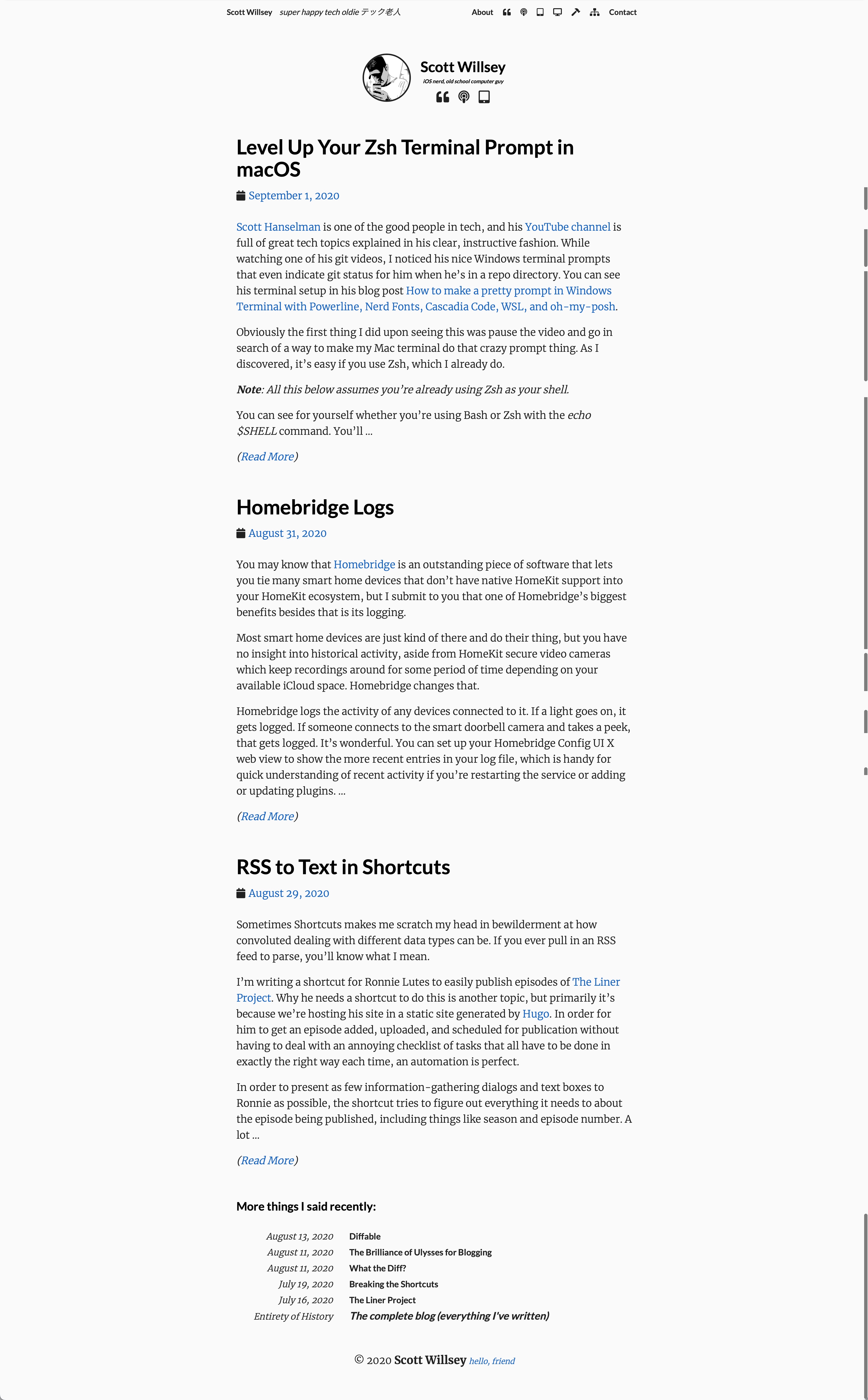 This site has had a lot of redesigns over the years. The worst were during the Wordpress years. The site started getting good1 during the Hugo and Eleventy years, and my satisfaction with it has only increased in the current Astro incarnation.2