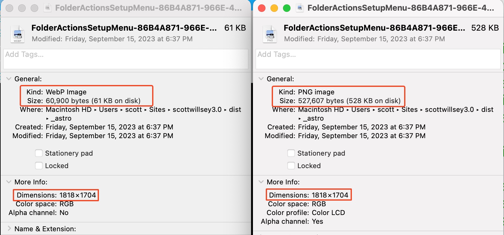 scott@Songoku:scottwillsey3.0 main ✗ 2d △ ➜ cd dist/_astroscott@Songoku:_astro main ✗ 2d △ ➜ ll FolderActionsSetupMenu*-rw-r--r--@ 1 scott staff 527607 Sep 15 18:37 FolderActionsSetupMenu-86B4A871-966E-4A27-A2C5-3FC85E131D6C.4464166b.png-rw-r--r--@ 1 scott staff 60900 Sep 15 18:37 FolderActionsSetupMenu-86B4A871-966E-4A27-A2C5-3FC85E131D6C.4464166b_Q8a7k.webpscott@Songoku:_astro main ✗ 2d △ ➜One thing that isn’t different is the image dimensions: