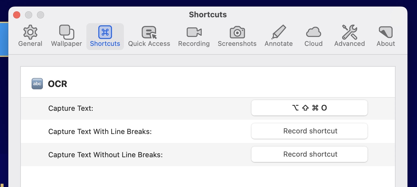 CleanShot X does Text Recognition a little differently than other apps. With CleanShot X, you can use a keyboard shortcut to bring up a capture tool, exactly like a screenshot capture tool, and you drag over the area you want text recognition in. In my case, I have ⌥⇧⌘O set as my keyboard shortcut.