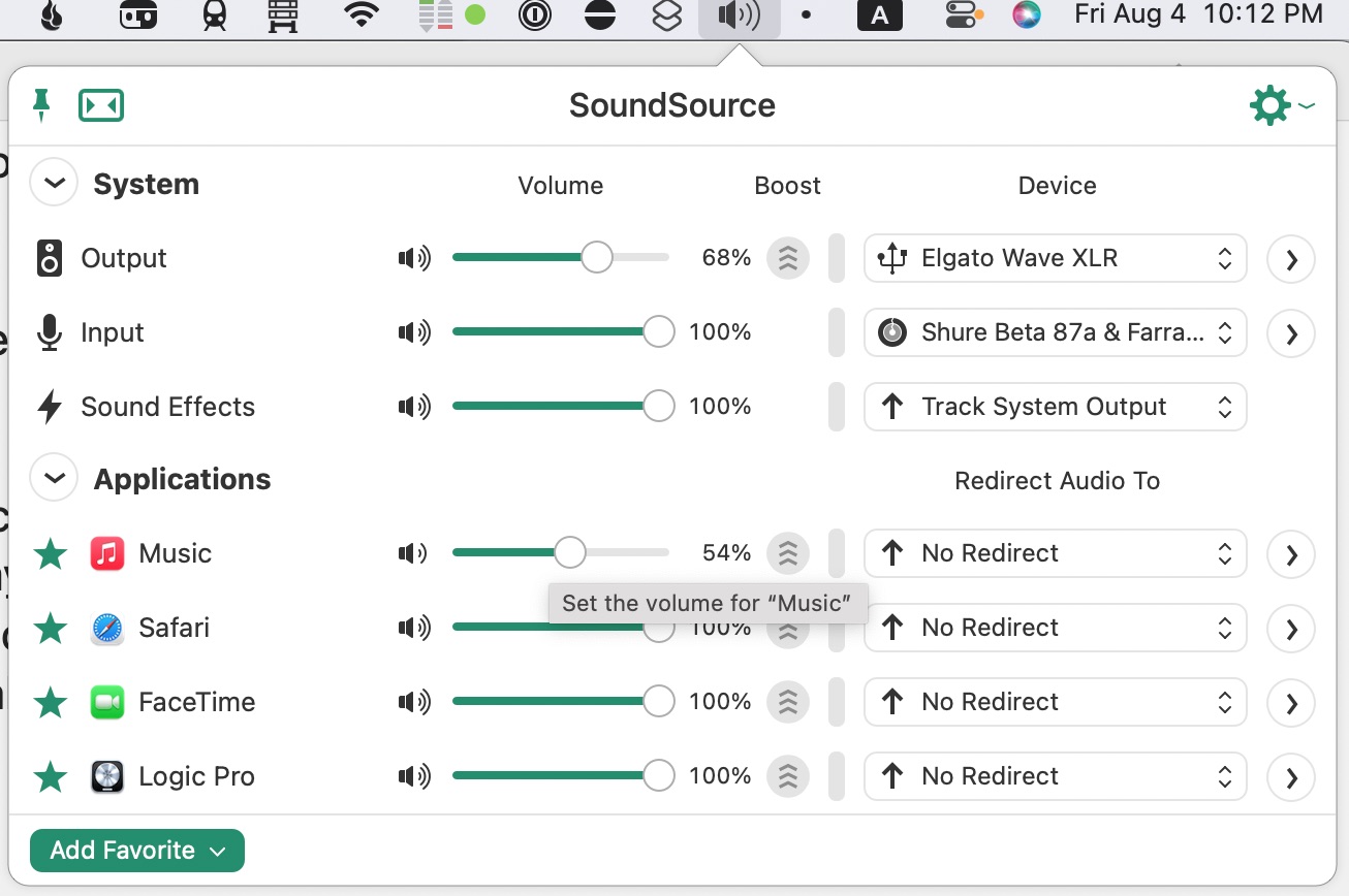 Usually, even though each app can have its own inputs and outputs separate from the system settings, I just set my system settings to the output I want (my Elgato Wave XLR, which my podcasting headphones are plugged into) and the input that I want (my Loopback input source that combines my mic and Farrago).