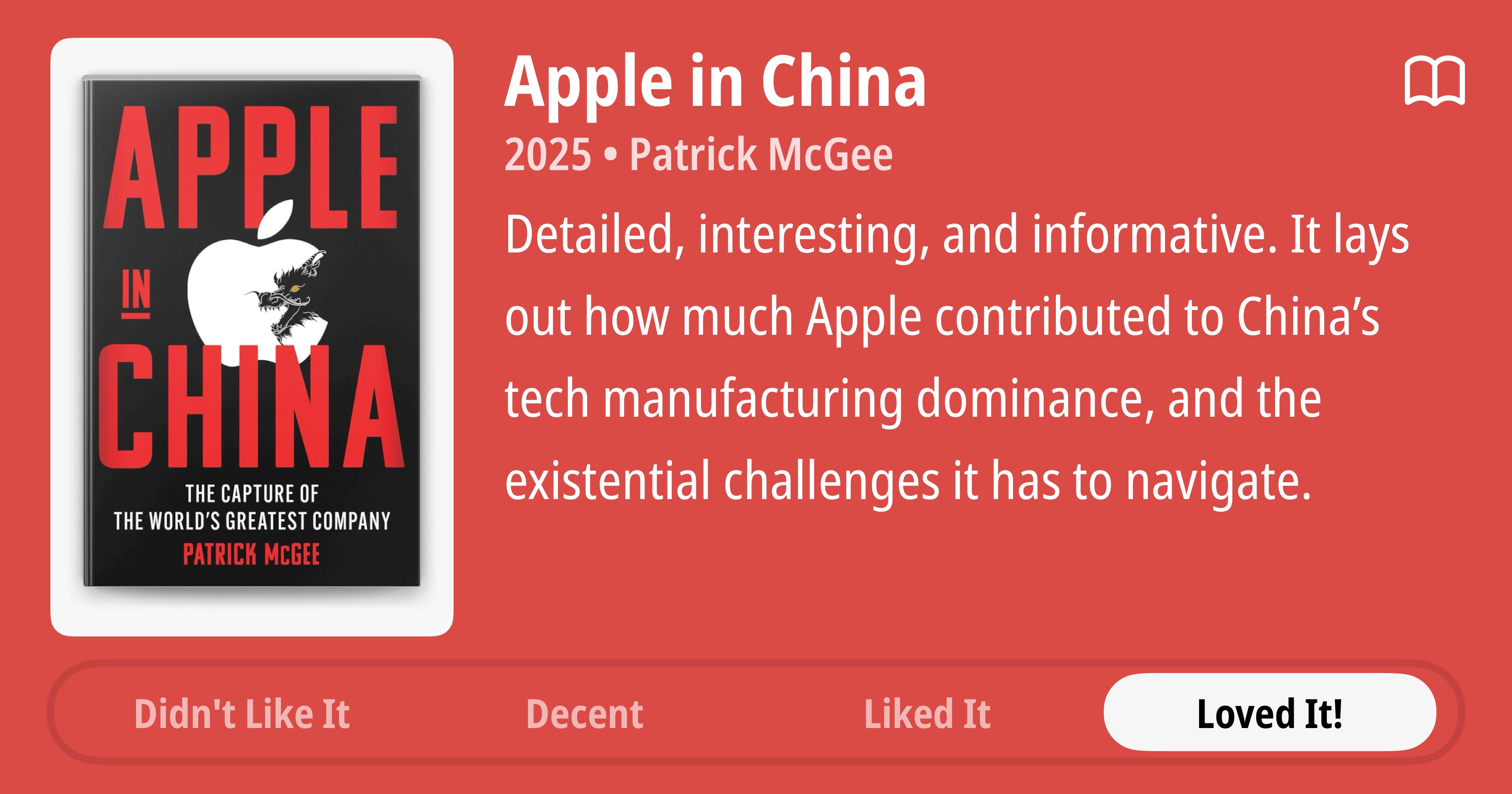Apple in China • 2025 • Patrick McGee • Detailed, interesting, and informative. It lays out how much Apple contributed to China's tech manufacturing dominance, and the existential challenges it has to navigate. • Loved It!