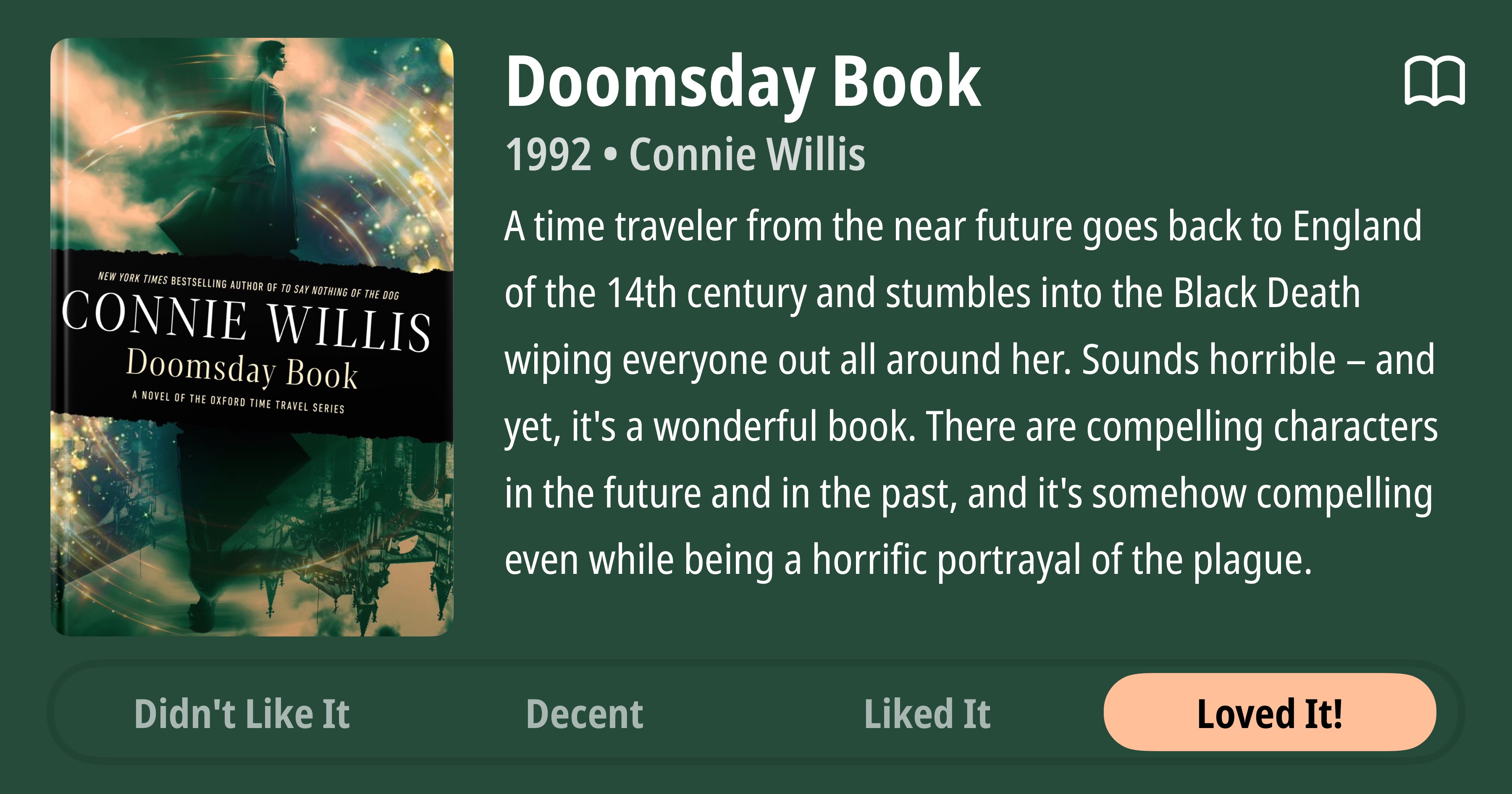 Doomsday Book • 1992 • Connie Willis A time traveler from the near future goes back to England of the 14th century and stumbles into the Black Death wiping everyone out all around her. Sounds horrible - and yet, it's a wonderful book. There are compelling characters in the future and in the past, and it's somehow compelling even while being a horrific portrayal of the plague. • Loved It!