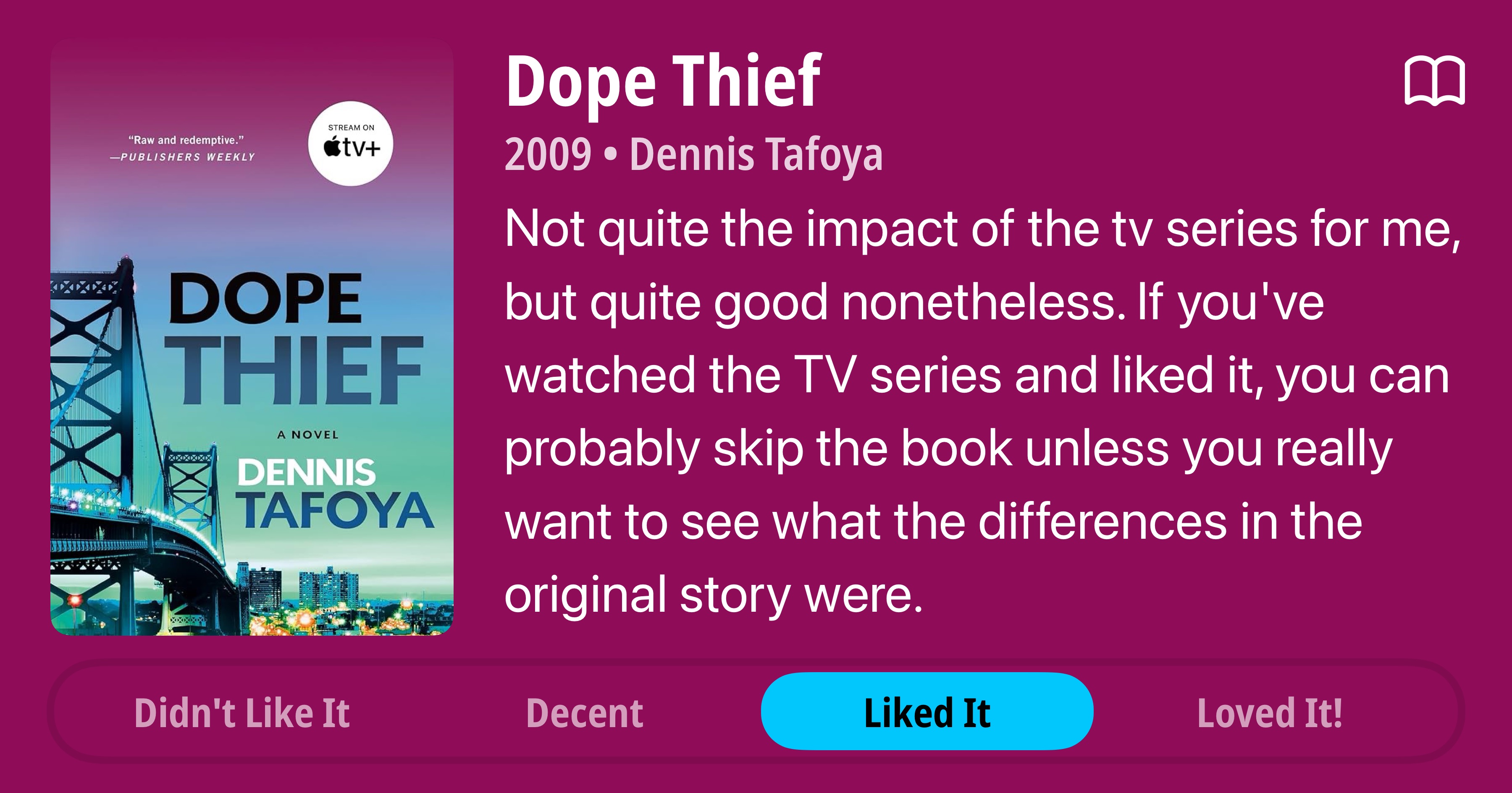 Dope Thief • 2009 • Dennis Tafoya • Not quite the impact of the tv series for me, but quite good nonetheless. If you've watched the TV series and liked it, you can probably skip the book unless you really want to see what the differences in the original story were. • Liked It
