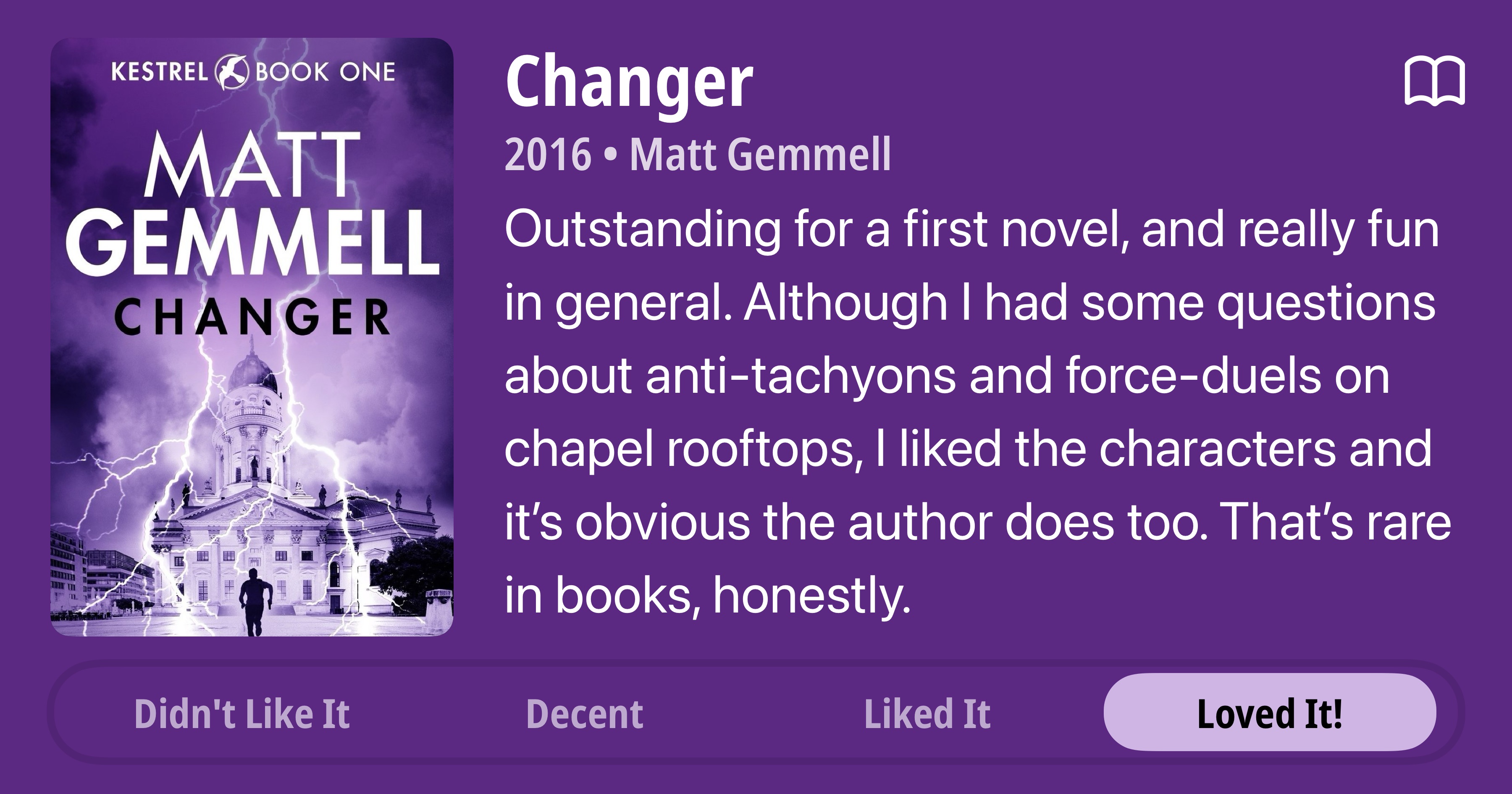 Changer • 2016 • Matt Gemmell • Outstanding for a first novel, and really fun in general. Although I had some questions about anti-tachyons and force-duels on chapel rooftops, l liked the characters and it's obvious the author does too. That's rare in books, honestly. • Loved It!