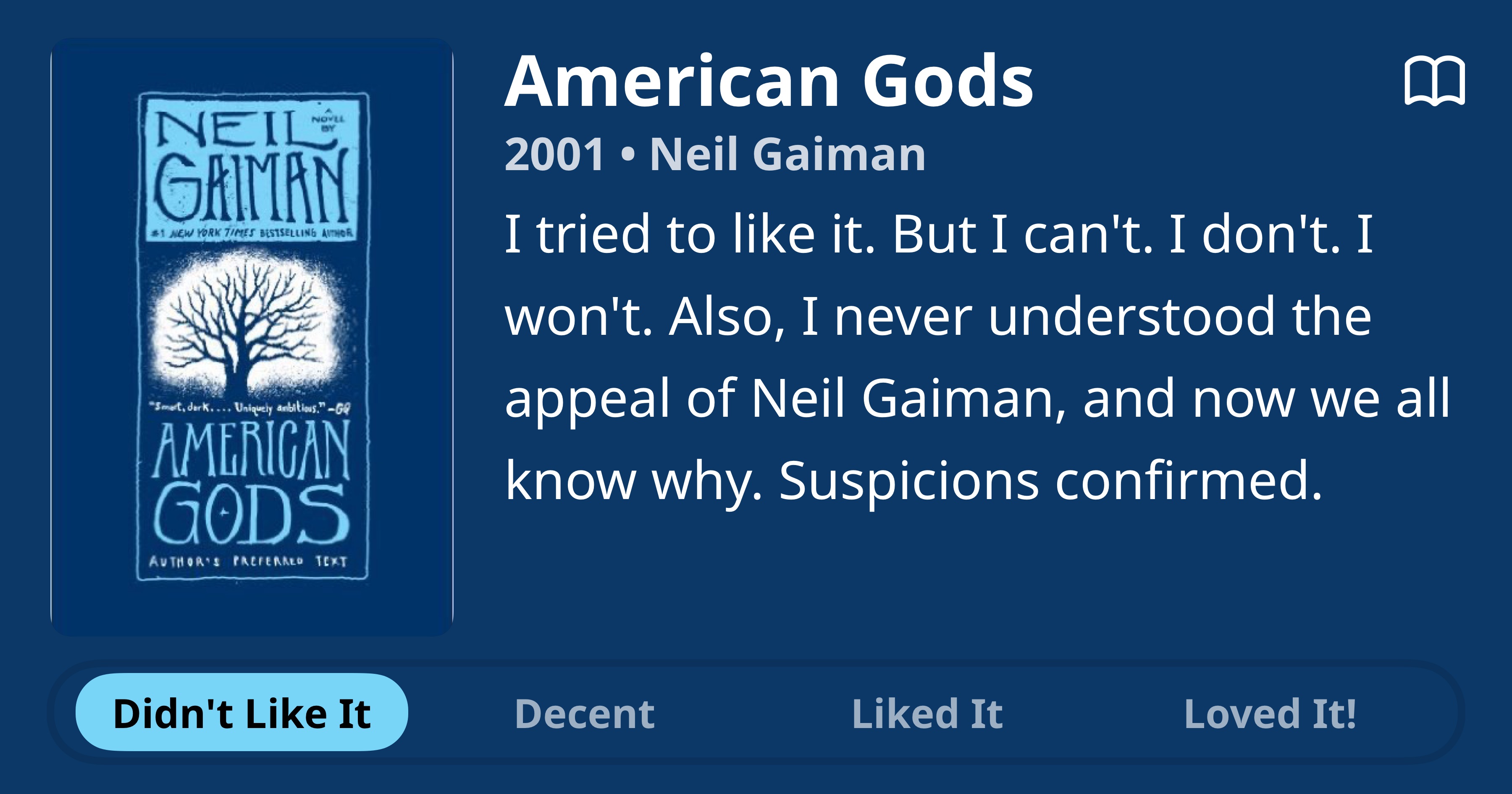 American Gods • 2001 • Neil Gaiman • I tried to like it. But I can't. I don't. I won't. Also, I never understood the appeal of Neil Gaiman, and now we all know why. Suspicions confirmed. • Didn't Like It