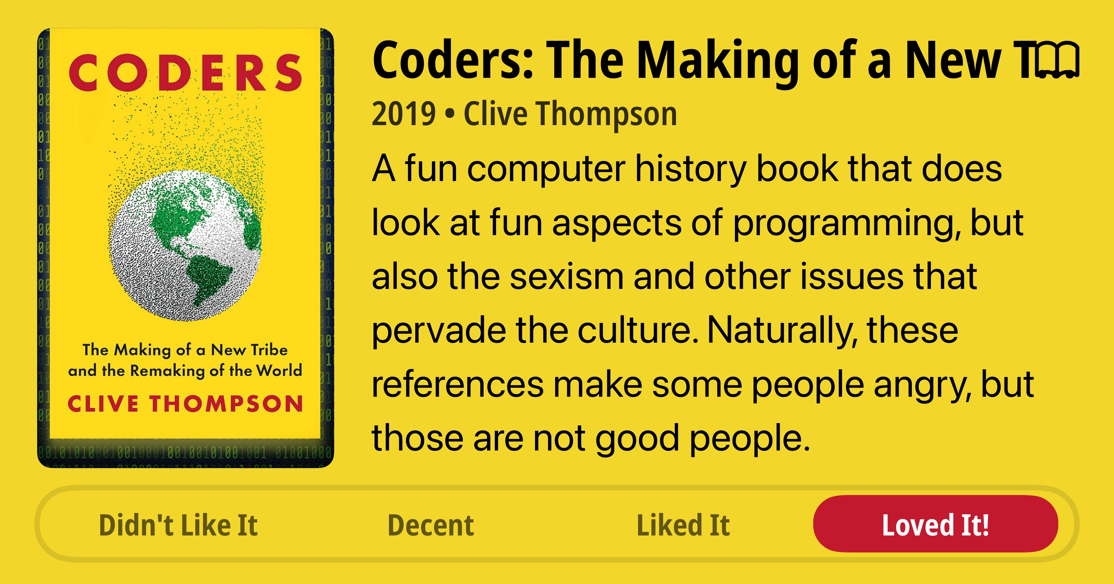 Coders: The Making of a New Tribe and the Remaking of the World • 2019 • Clive Thompson • A fun computer history book that does look at fun aspects of programming, but also the sexism and other issues that pervade the culture. Naturally, these references make some people angry, but those are not good people. • Loved It!