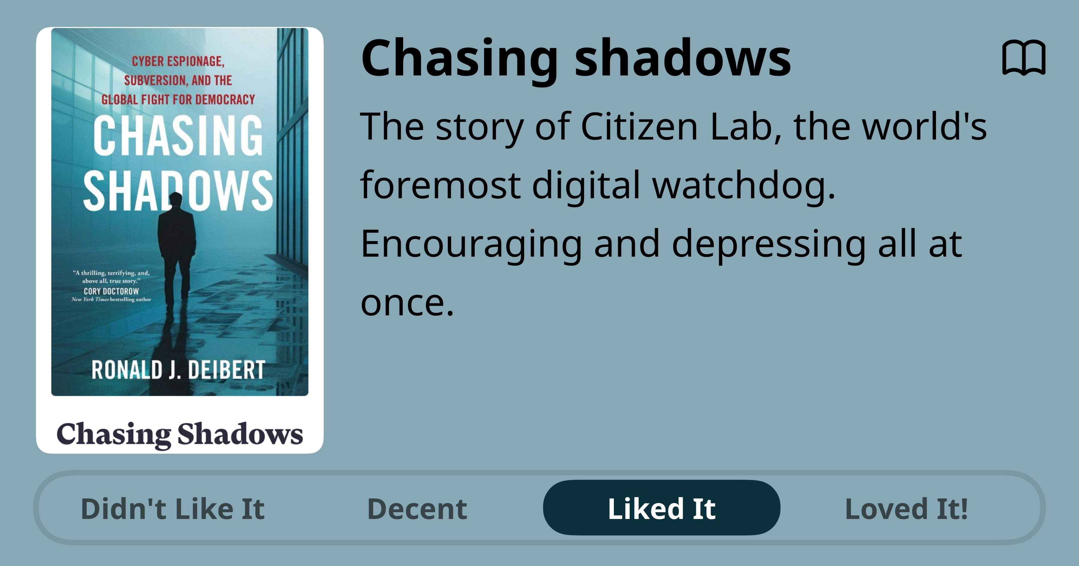Chasing Shadows • Just started it... The story of Citizen Lab, the world's foremost digital watchdog. Encouraging and depressing all at once. • Liked It