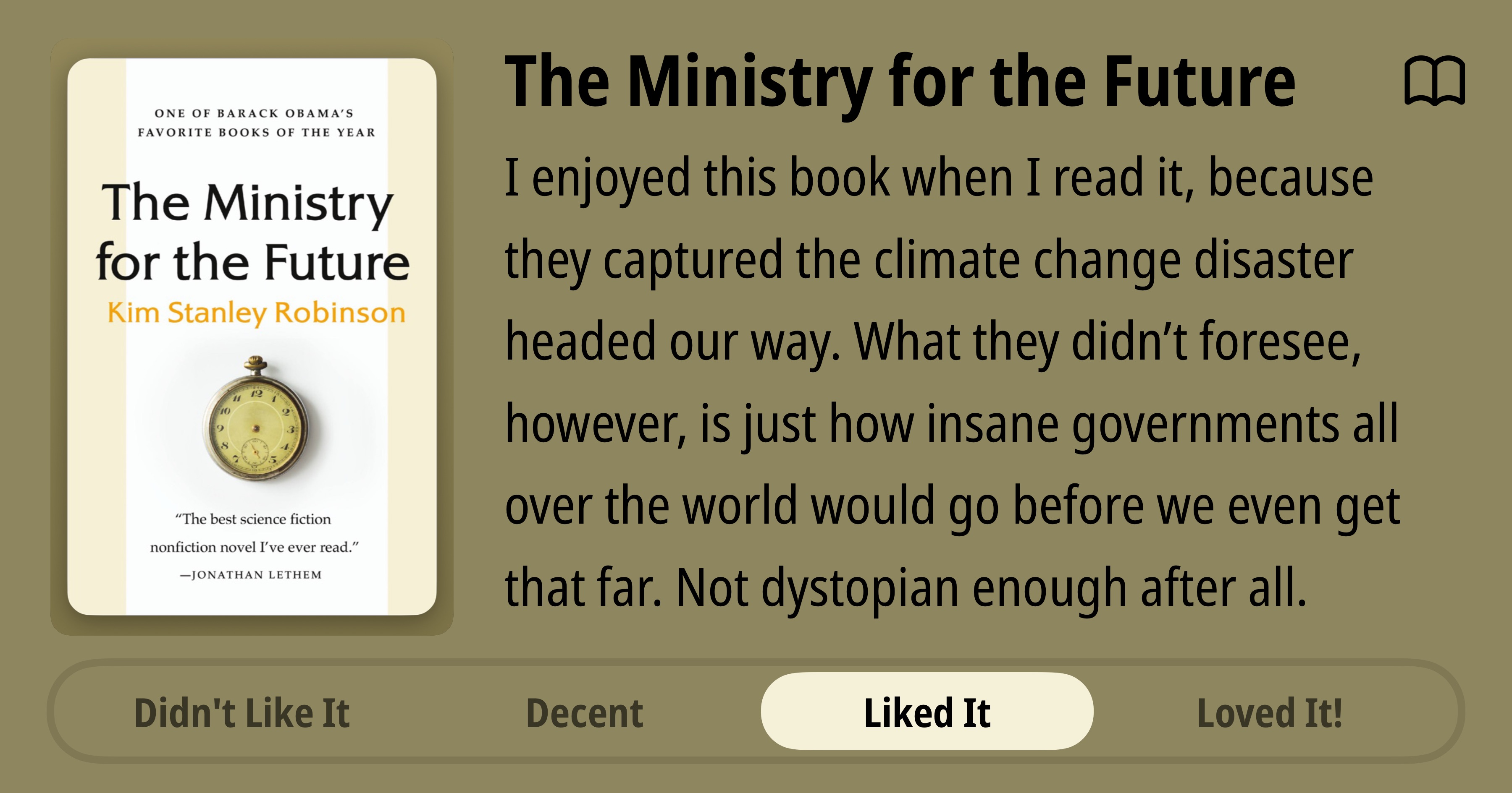 The Ministry for the Future • Kim Stanley Robinson • I enjoyed this book when I read it, because they captured the climate change disaster headed our way. What they didn't foresee, however, is just how insane governments all over the world would go before we even get that far. Not dystopian enough after all. • Liked It