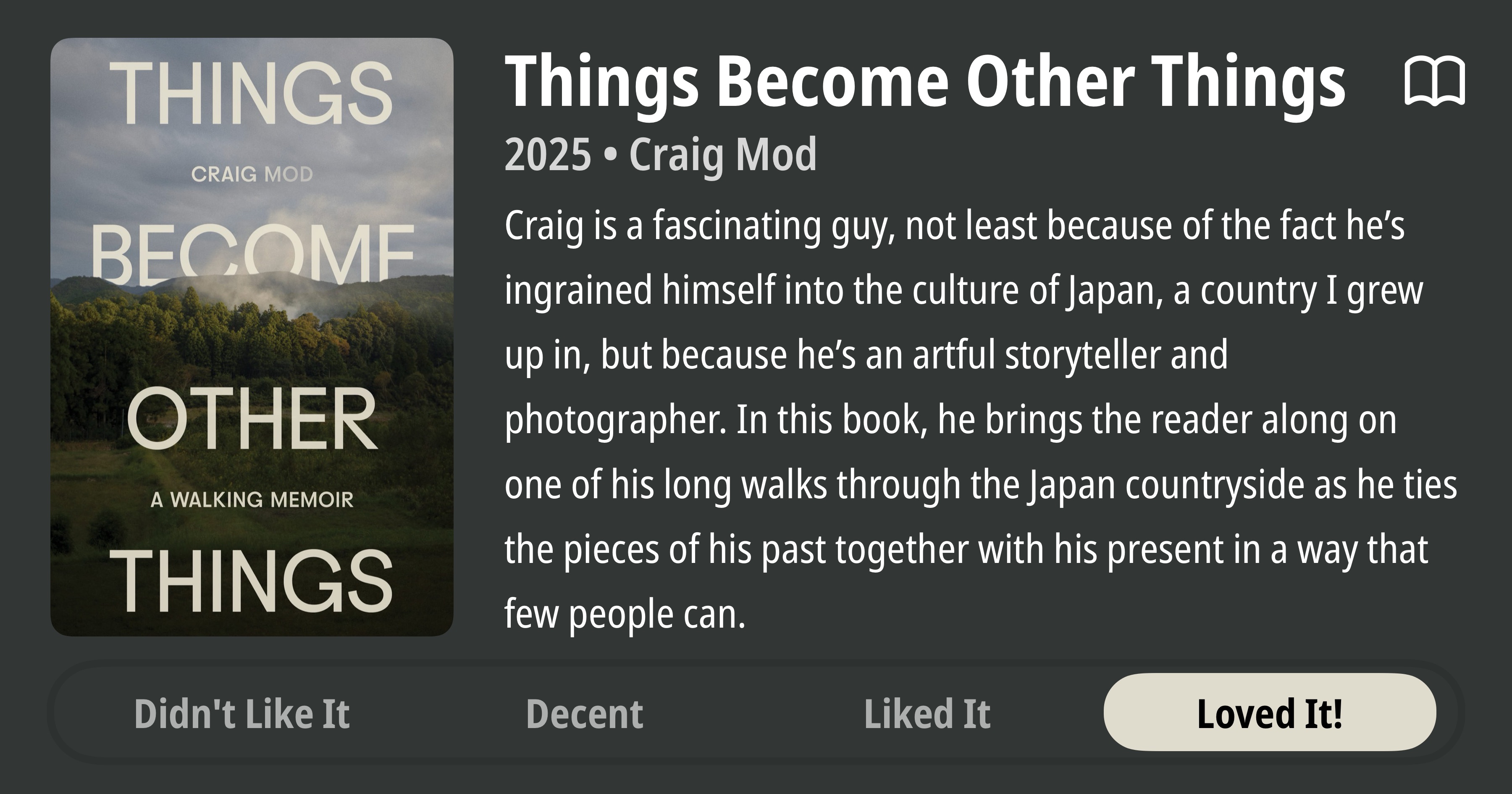 Things Become Other Things • 2025 • Craig Mod Craig is a fascinating guy, not least because of the fact he's ingrained himself into the culture of Japan, a country I grew up in, but because he's an artful storyteller and photographer. In this book, he brings the reader along on one of his long walks through the Japan countryside as he ties the pieces of his past together with his present in a way that few people can. • Loved It!