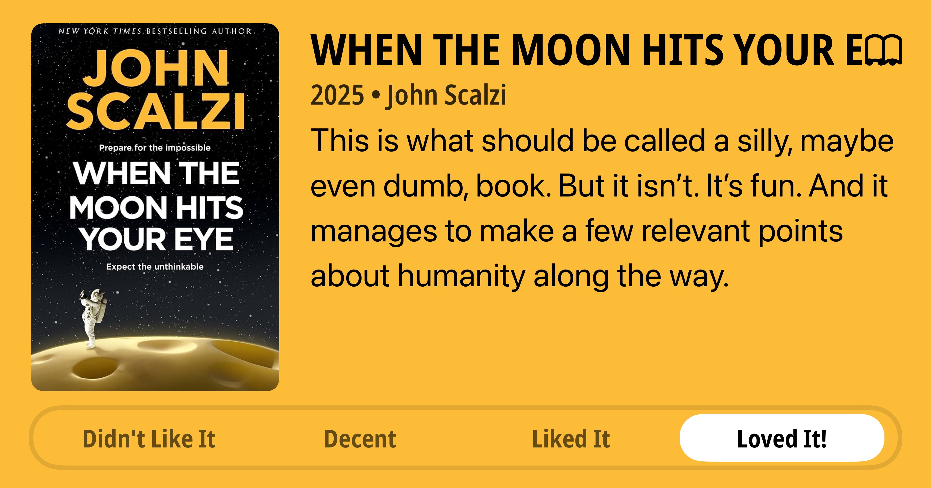 When the Moon Hits Your Eye • 2025 • John Scalzi This is what should be called a silly, maybe even dumb, book. But it isn't. It's fun. And it manages to make a few relevant points about humanity along the way. • Loved It!