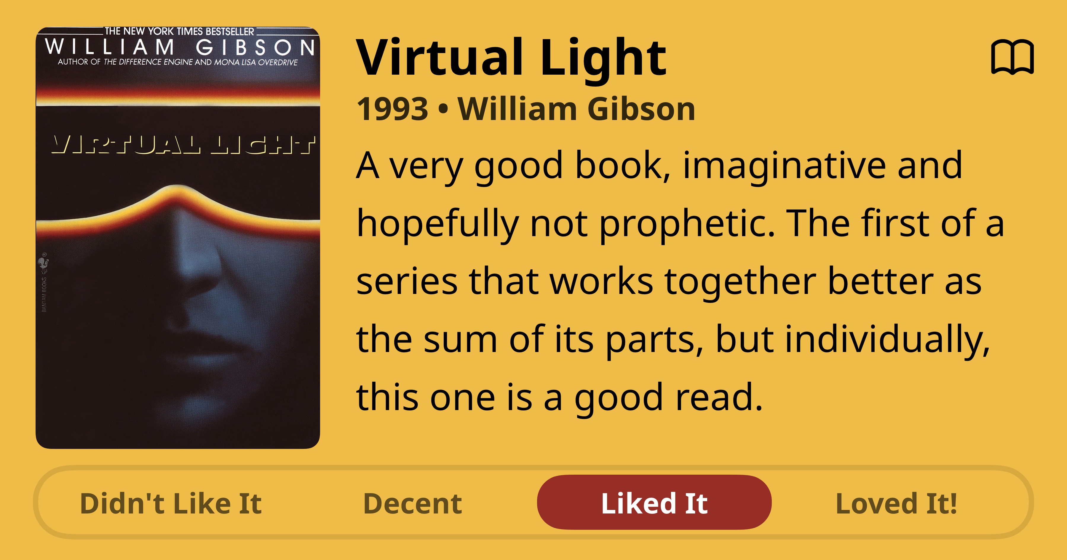 Virtual Light • 1993 • William Gibson • A very good book, imaginative and hopefully not prophetic. The first of a series that works together better as the sum of its parts, but individually, this one is a good read. • Liked It