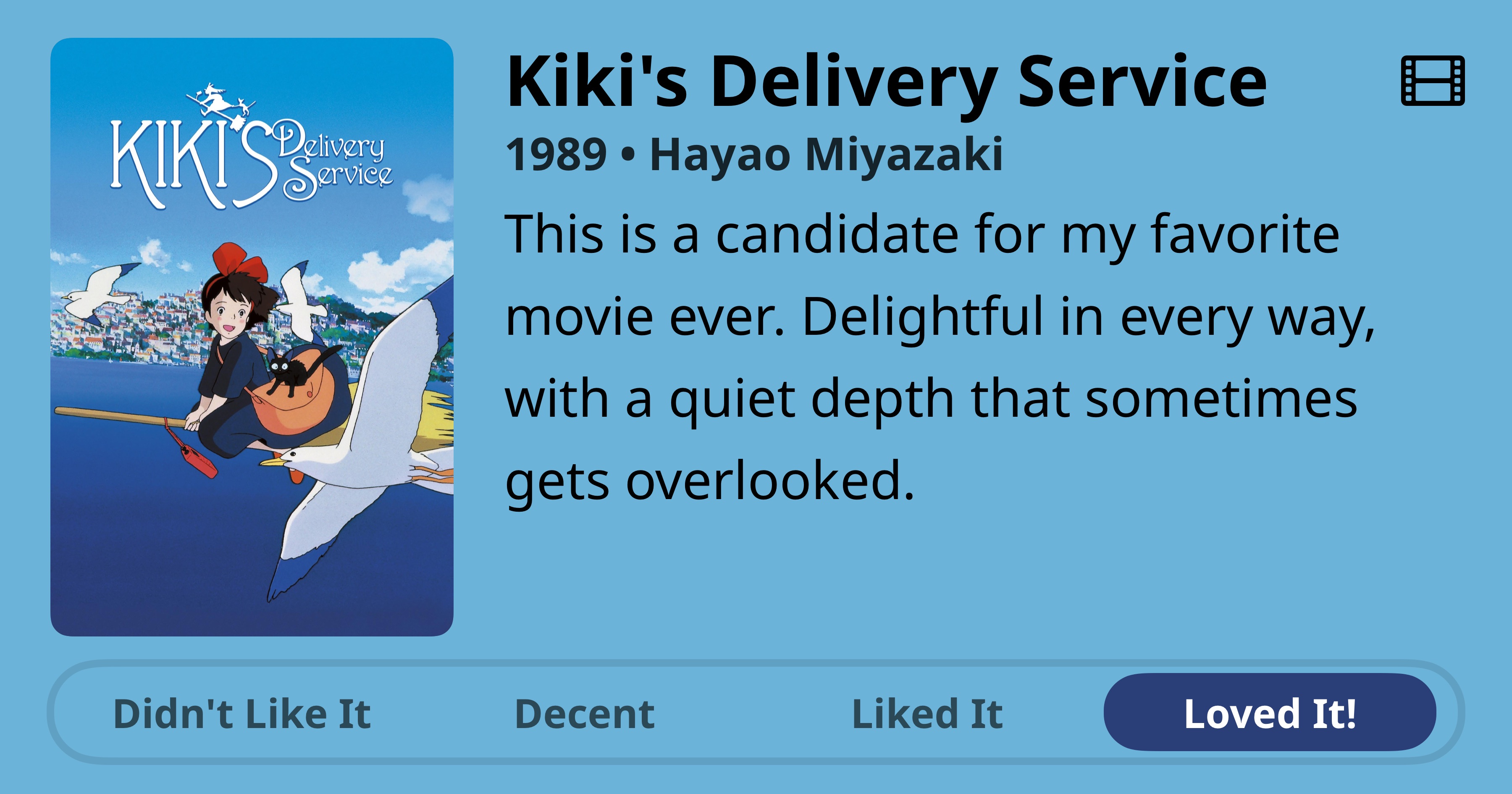 Kiki's Delivery Service• 1989 • Hayao Miyazaki• This is a candidate for my favorite movie ever. Delightful in every way, with a quiet depth that sometimes gets overlooked.• Loved It!