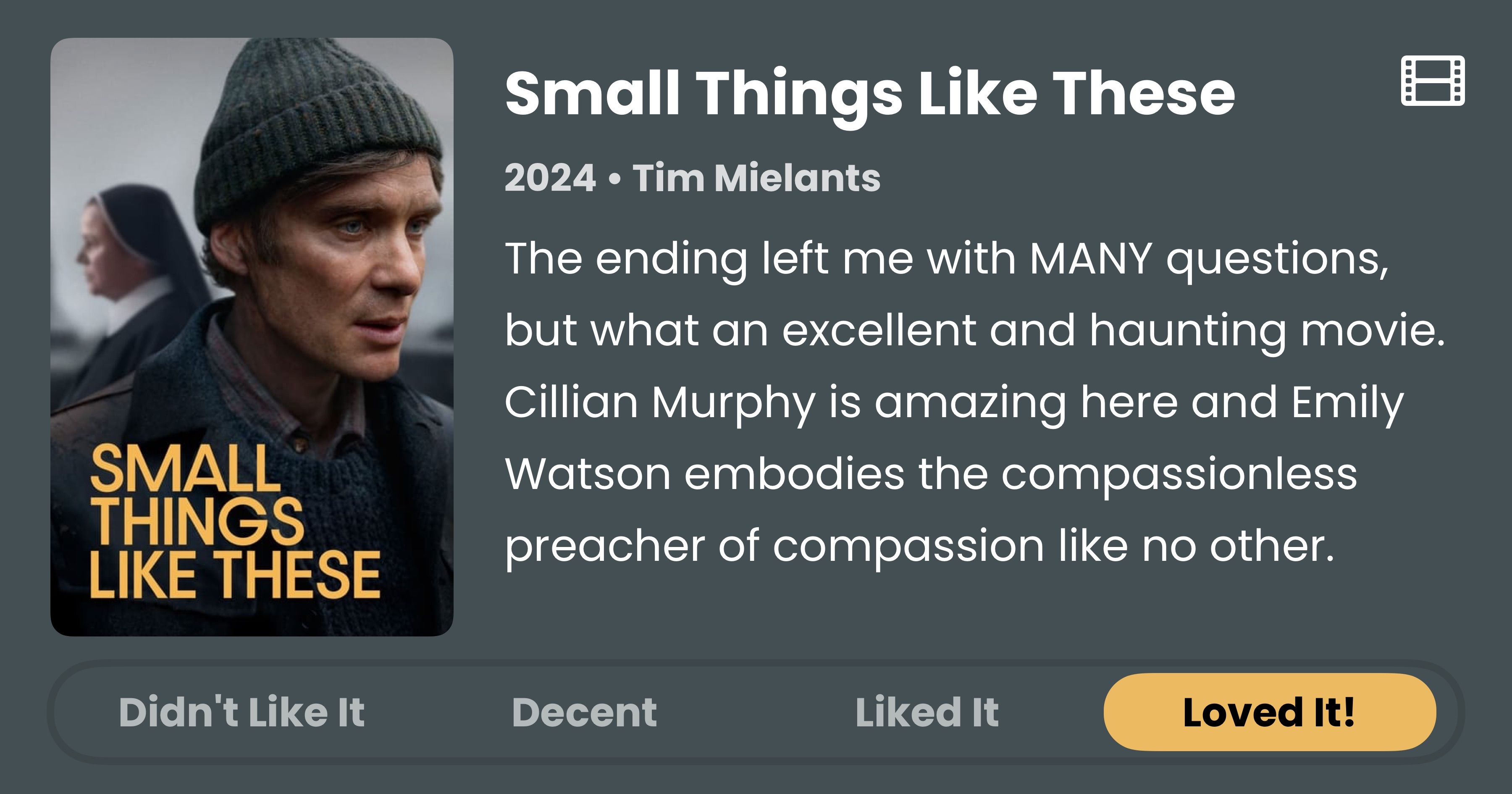 Small Things Like these • The ending left me with MANY questions, but what an excellent and haunting movie. Cillian Murphy is amazing here and Emily Watson embodies the compassionless preacher of compassion like no other. • Loved It!