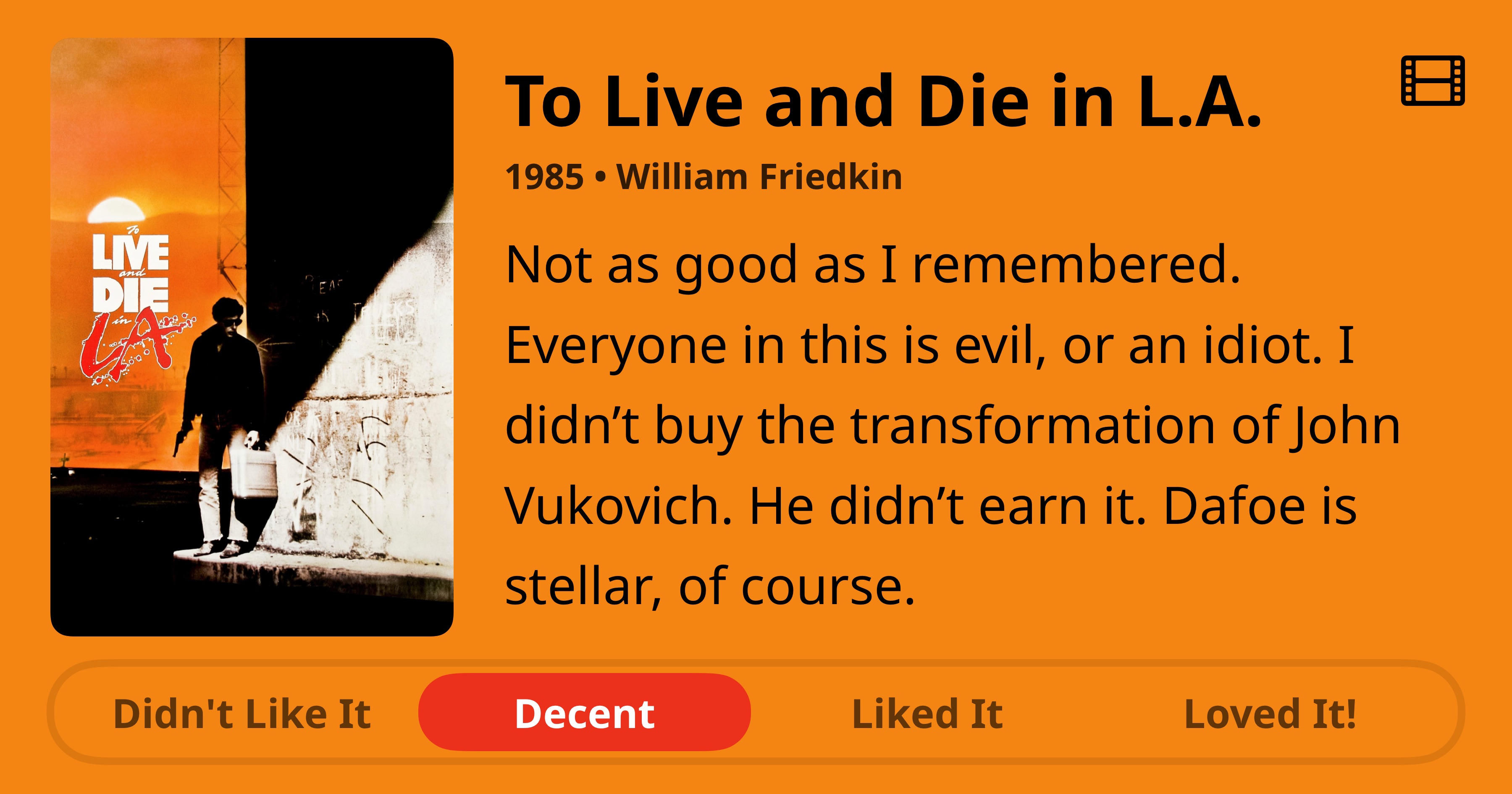 To Live and Die in L.A. 1985 • William Friedkin • Not as good as I remembered. Everyone in this is evil, or an idiot. I didn't buy the transformation of John Vukovich. He didn't earn it. Dafoe is stellar, of course. • Decent