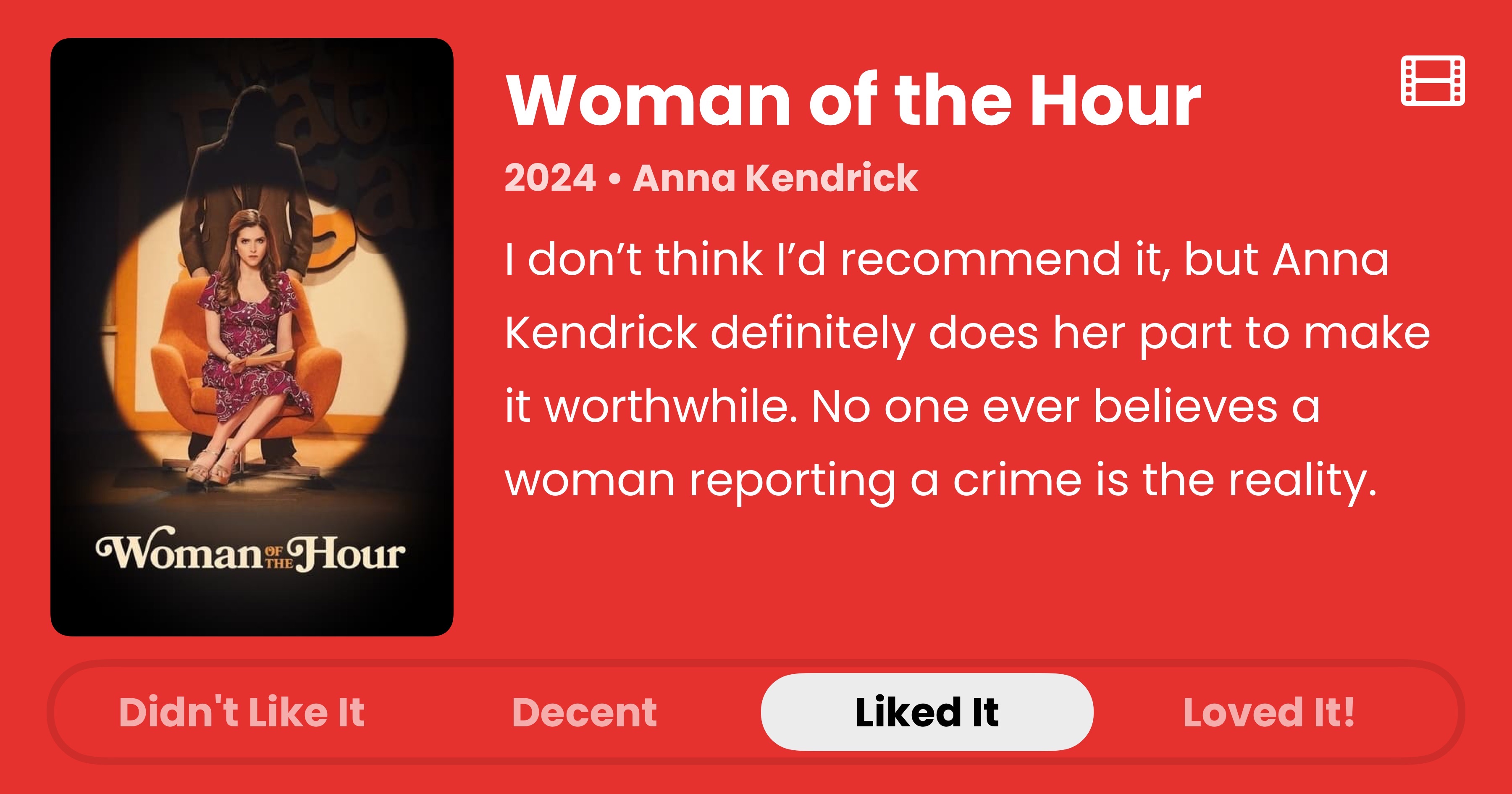 Woman of the Hour • 2024 • I don't think I'd recommend it, but Anna Kendrick definitely does her part to make it worthwhile. No one ever believes a woman reporting a crime is the reality. • Liked It