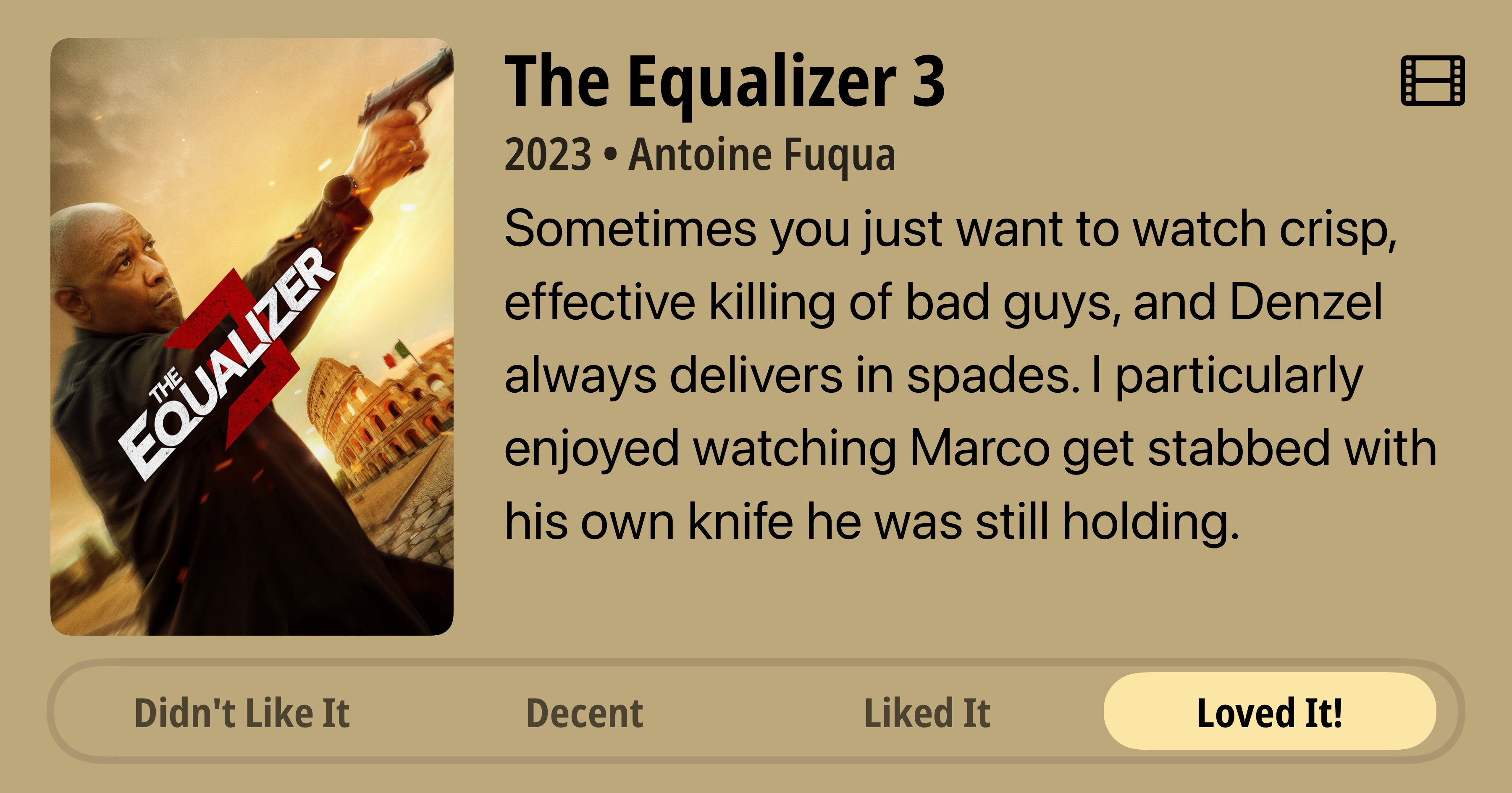 The Equalizer 3 • 2023 • Antoine Fuqua • Sometimes you just want to watch crisp, effective killing of bad guys, and Denzel always delivers in spades. I particularly enjoyed watching Marco get stabbed with his own knife he was still holding. • Loved It!