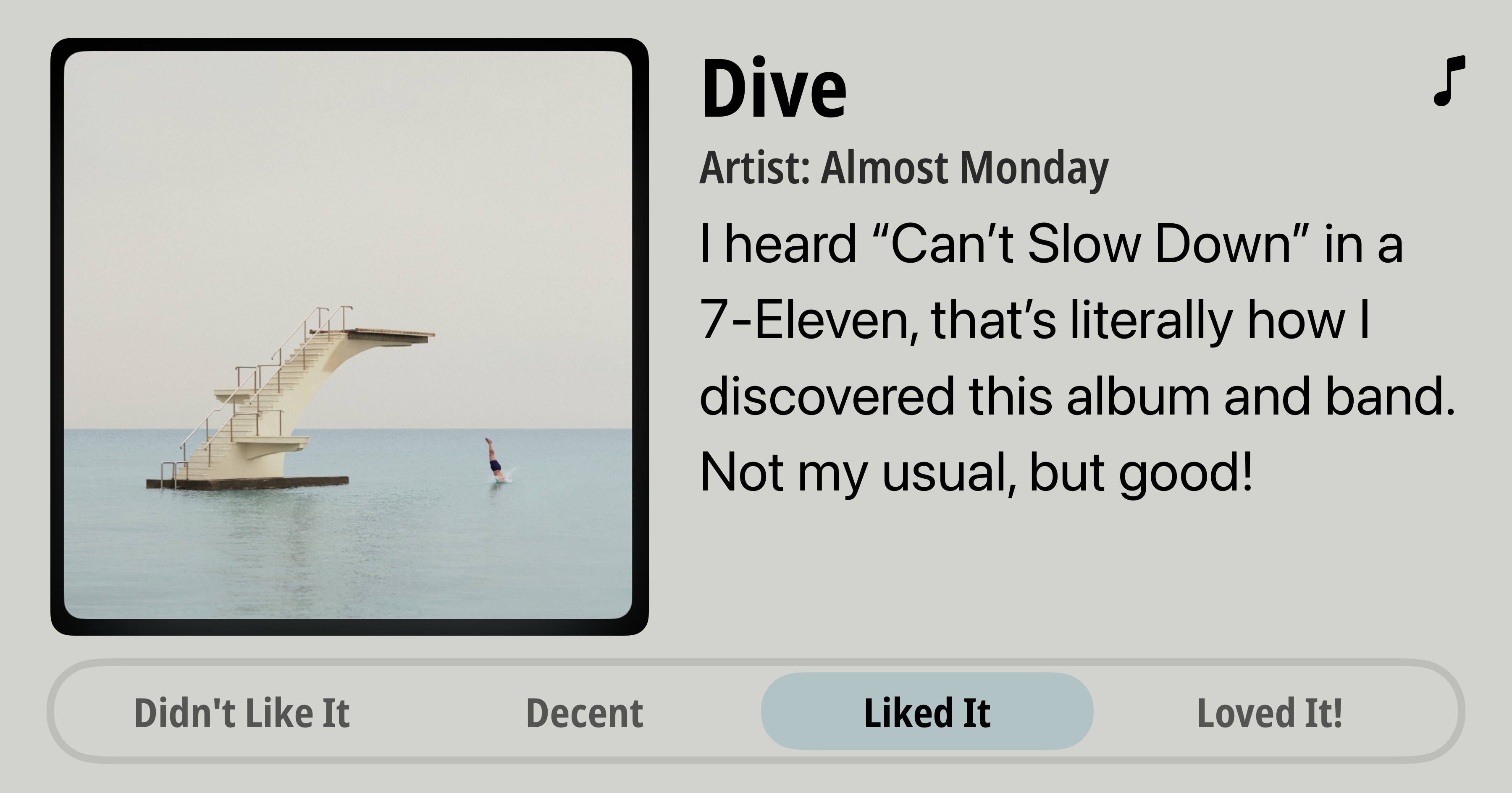 Dive • Artist: Almost Monday • I heard "Can't Slow Down" in a 7-Eleven, that's literally how I discovered this album and band Not my usual, but good! • Liked It