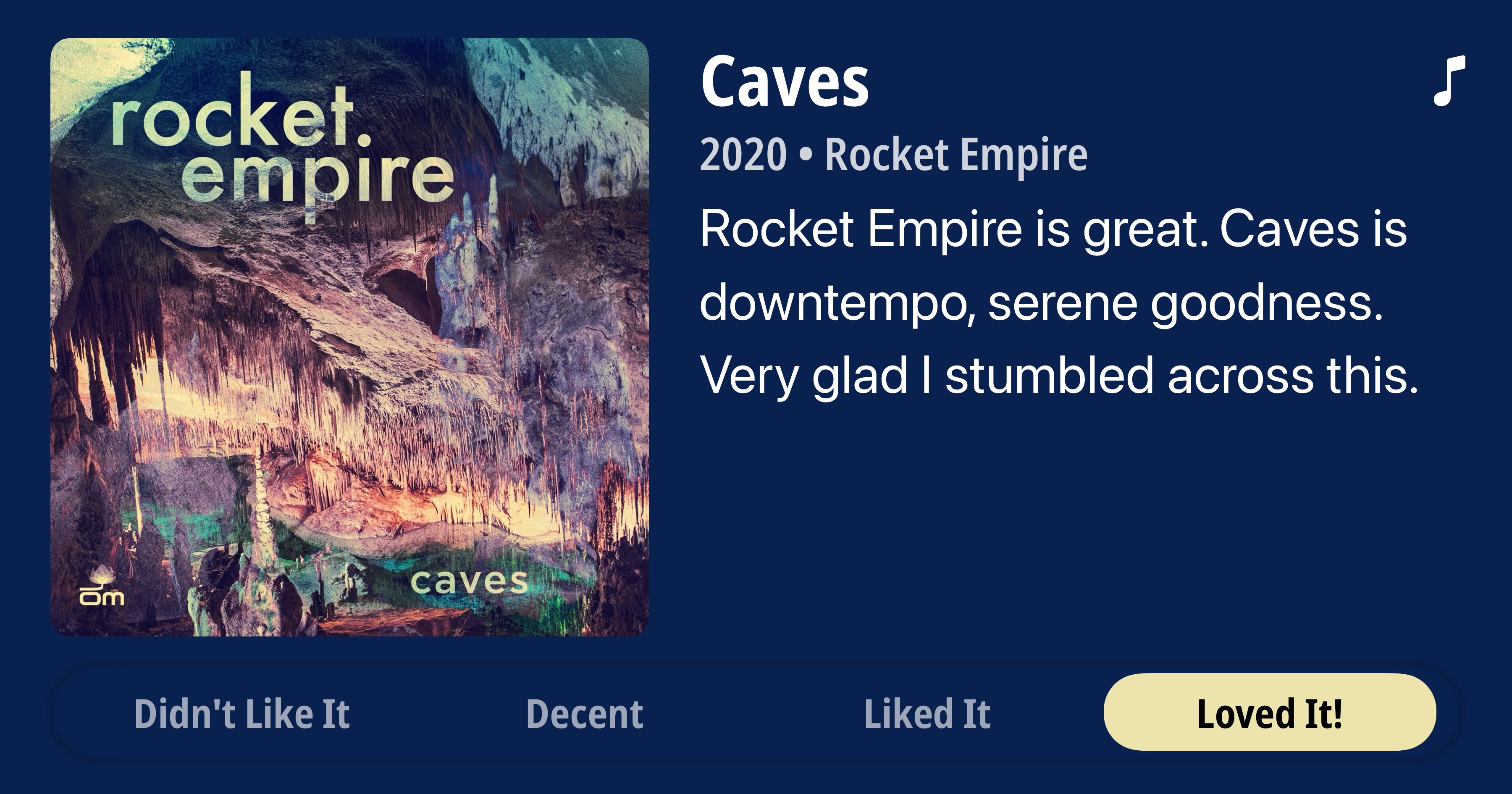 Caves • 2020 • Rocket Empire • Rocket Empire is great. Caves is downtempo, serene goodness. Very glad I stumbled across this. • Loved It!