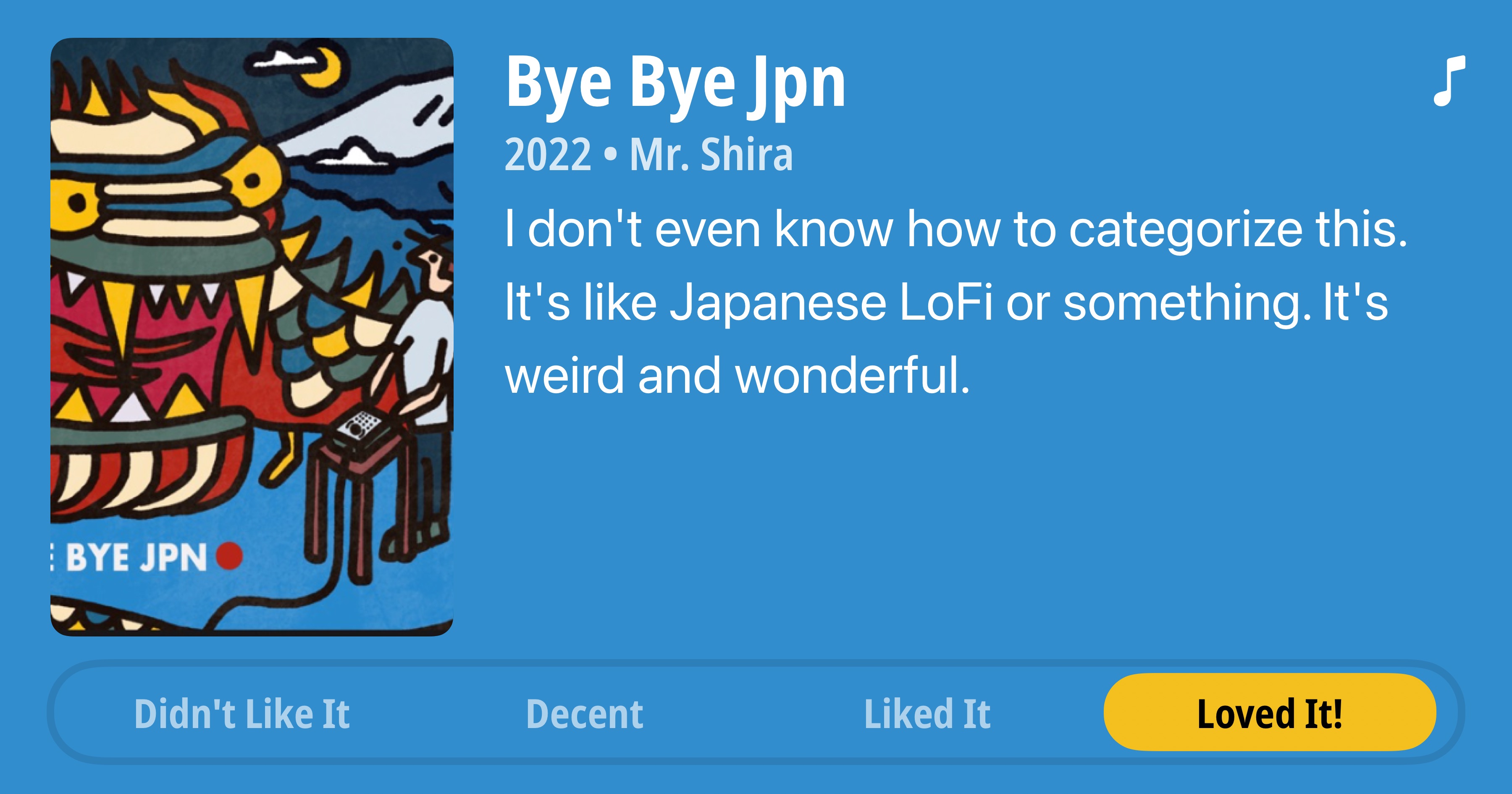 Bye Bye • Jpn 2022 • Mr. Shira • I don't even know how to categorize this. It's like Japanese LoFi or something. It's weird and wonderful. • Loved It!