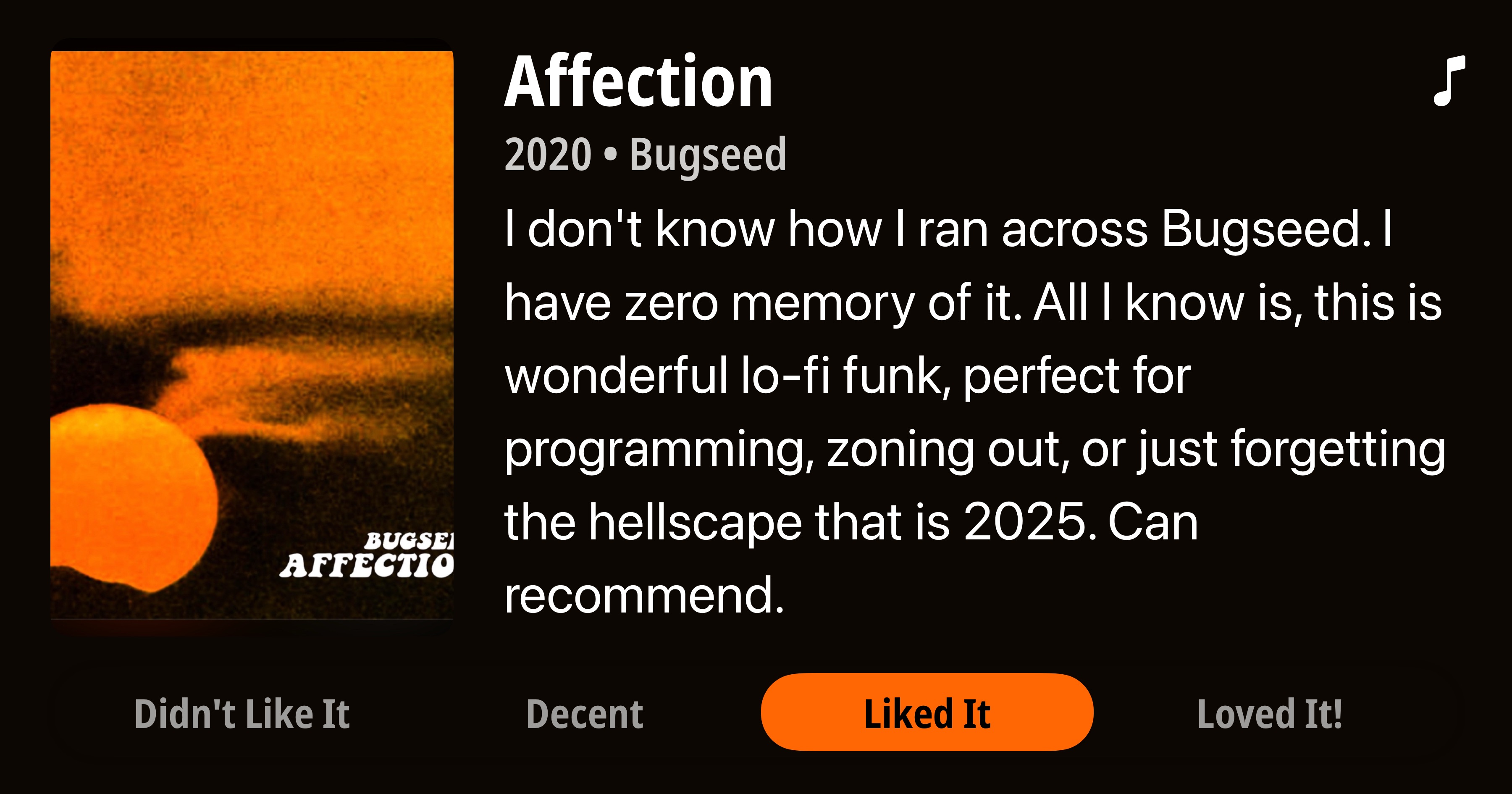 Affection • 2020 • Bugseed • I don't know how I ran across Bugseed. I have zero memory of it. All I know is, this is wonderful lo-fi funk, perfect for programming, zoning out, or just forgetting the hellscape that is 2025. Can recommend. • Liked It
