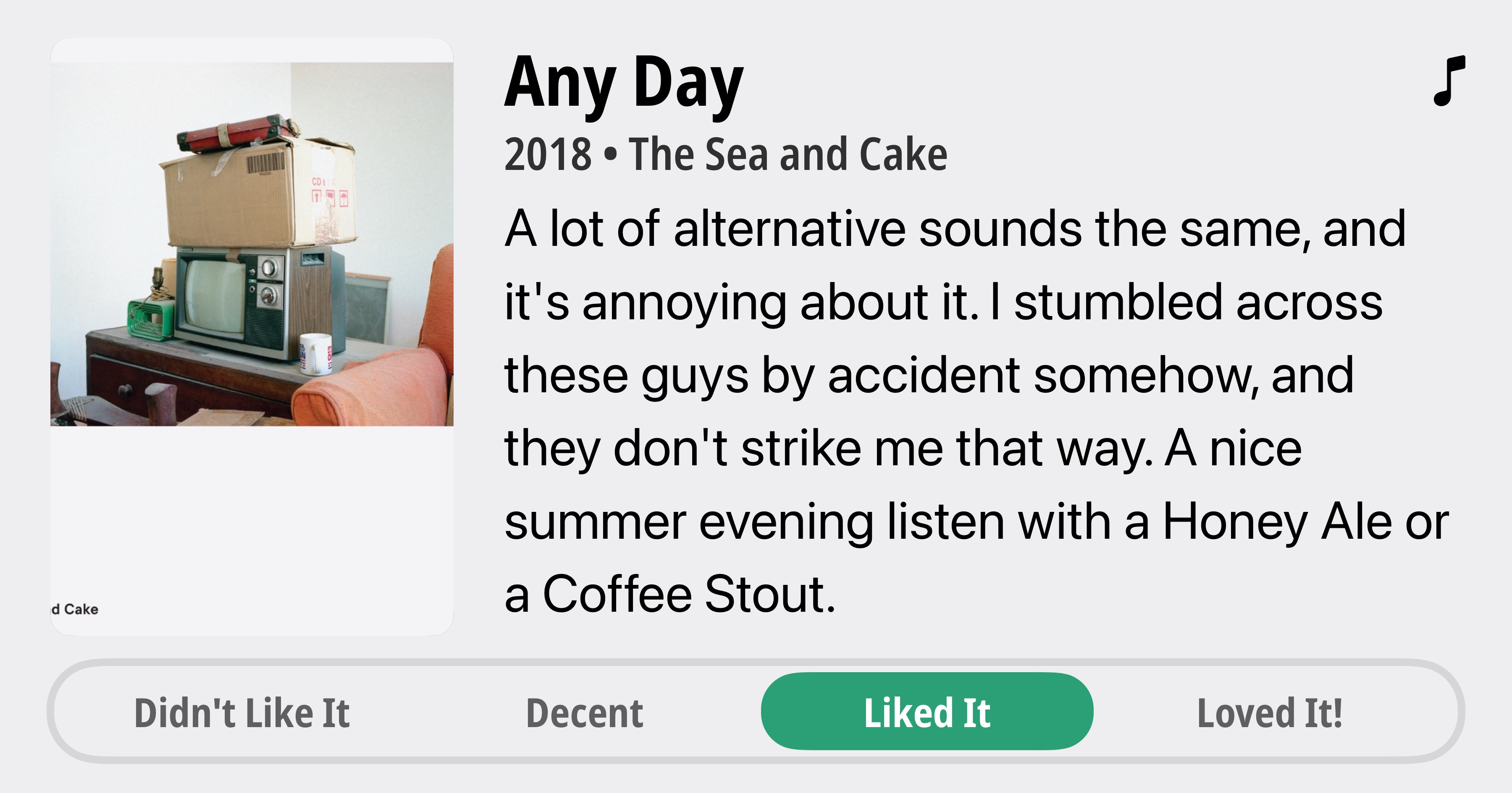 Any Day • 2018 • The Sea and Cake • A lot of alternative sounds the same, and it's annoying about it. I stumbled across these guys by accident somehow, and they don't strike me that way. A nice summer evening listen with a Honey Ale or a Coffee Stout. • Liked It