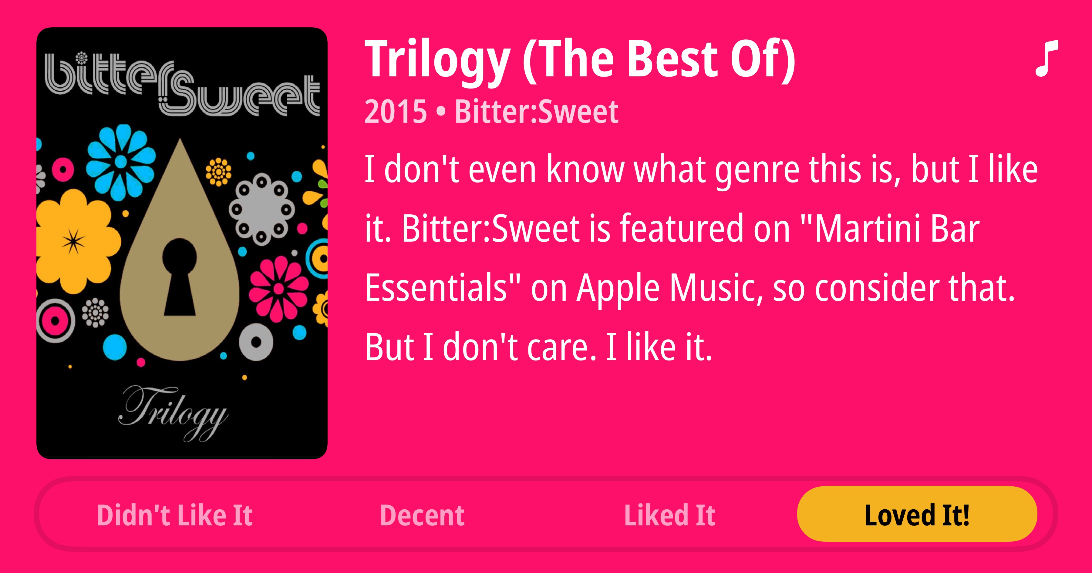 Trilogy (The Best Of) • 2015 • Bitter:Sweet • I don't even know what genre this is, but I like it. Bitter:Sweet is featured on "Martini Bar Essentials" on Apple Music, so consider that. But I don't care. I like it. • Loved It!
