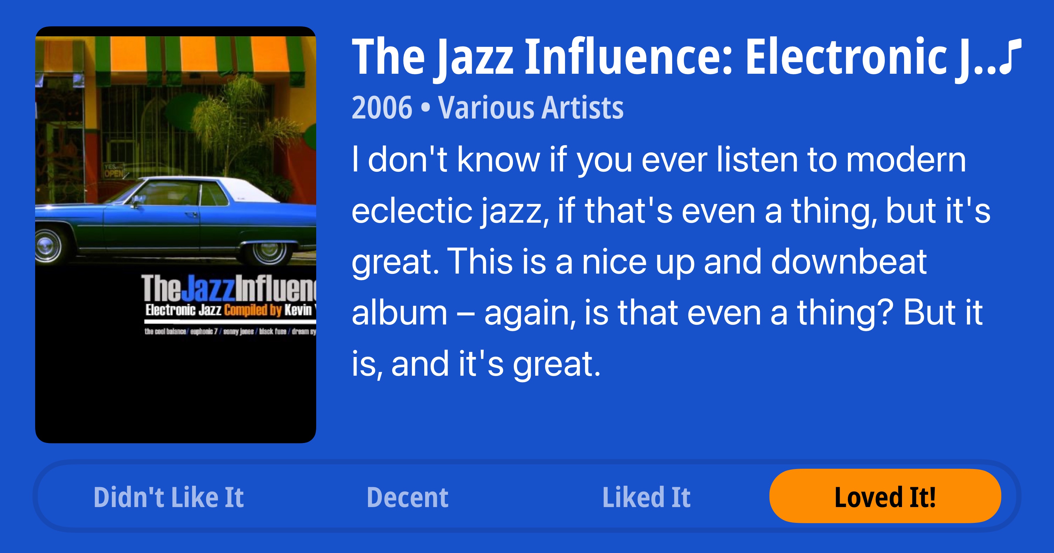 The Jazz Influence: Electronic Jazz Compiled by Kevin Yost • 2006 • Various Artists • I don't know if you ever listen to modern eclectic jazz, if that's even a thing, but it's great. This is a nice up and downbeat album - again, is that even a thing? But it is, and it's great. • Loved It!