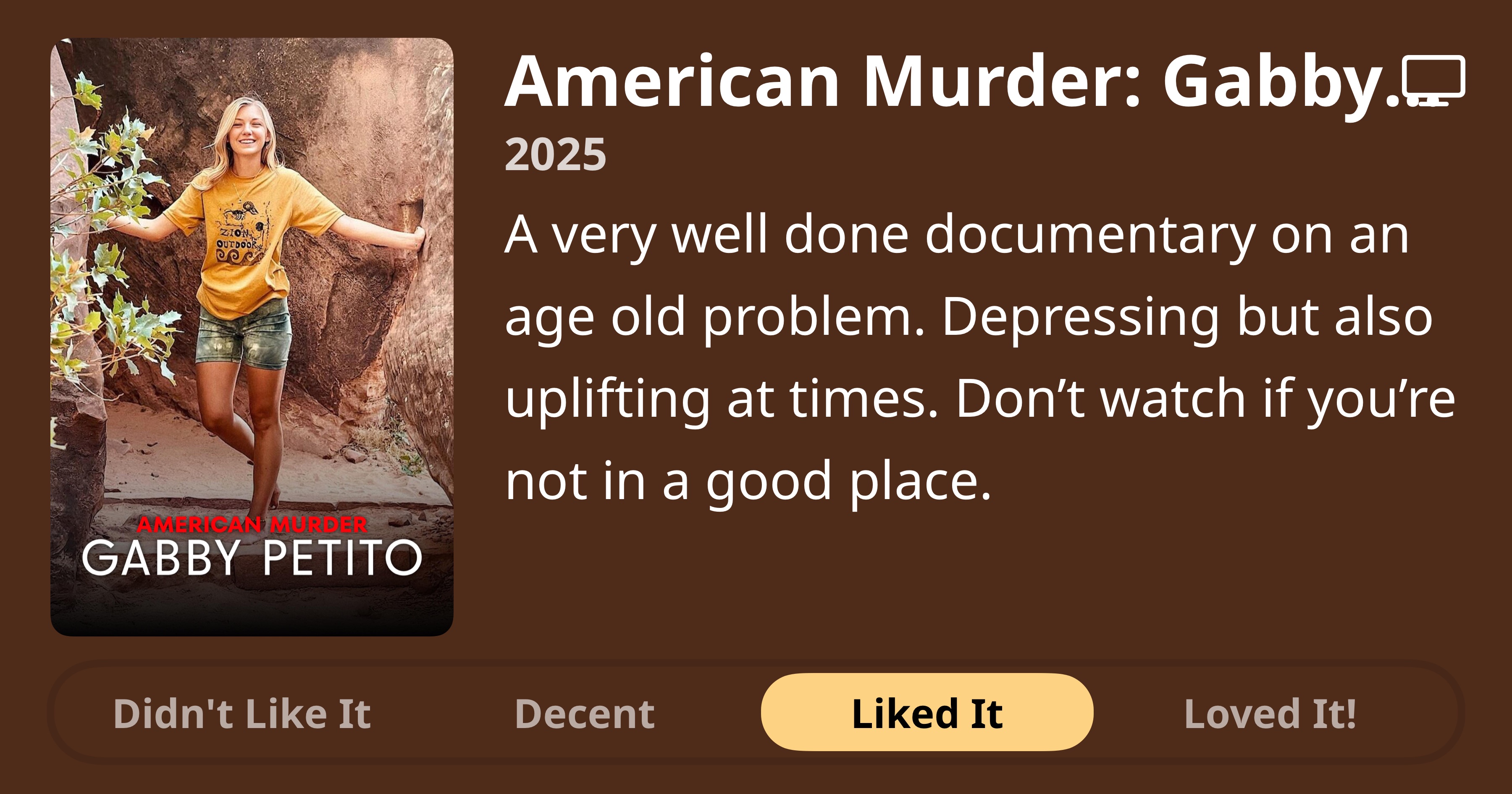 American Murder: Gabby Petito • 2025 • A very well done documentary on an age old problem. Depressing but also uplifting at times. Don't watch if you're not in a good place. • Liked It