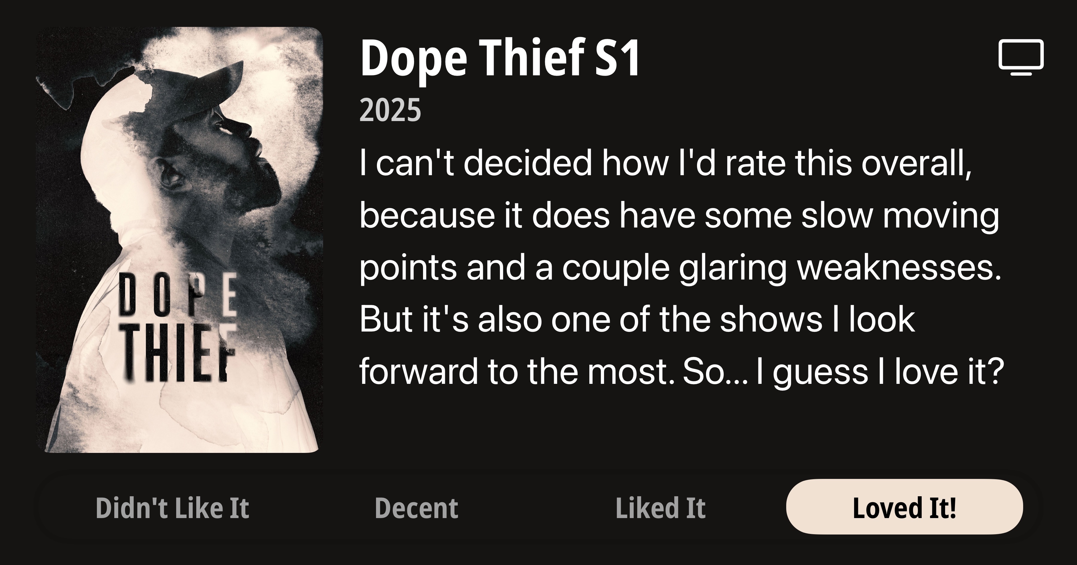 Dope Thief S1 • 2025 • I can't decided how l'd rate this overall, because it does have some slow moving points and a couple glaring weaknesses. But it's also one of the shows I look forward to the most. So... I guess I love it? • Loved It!
