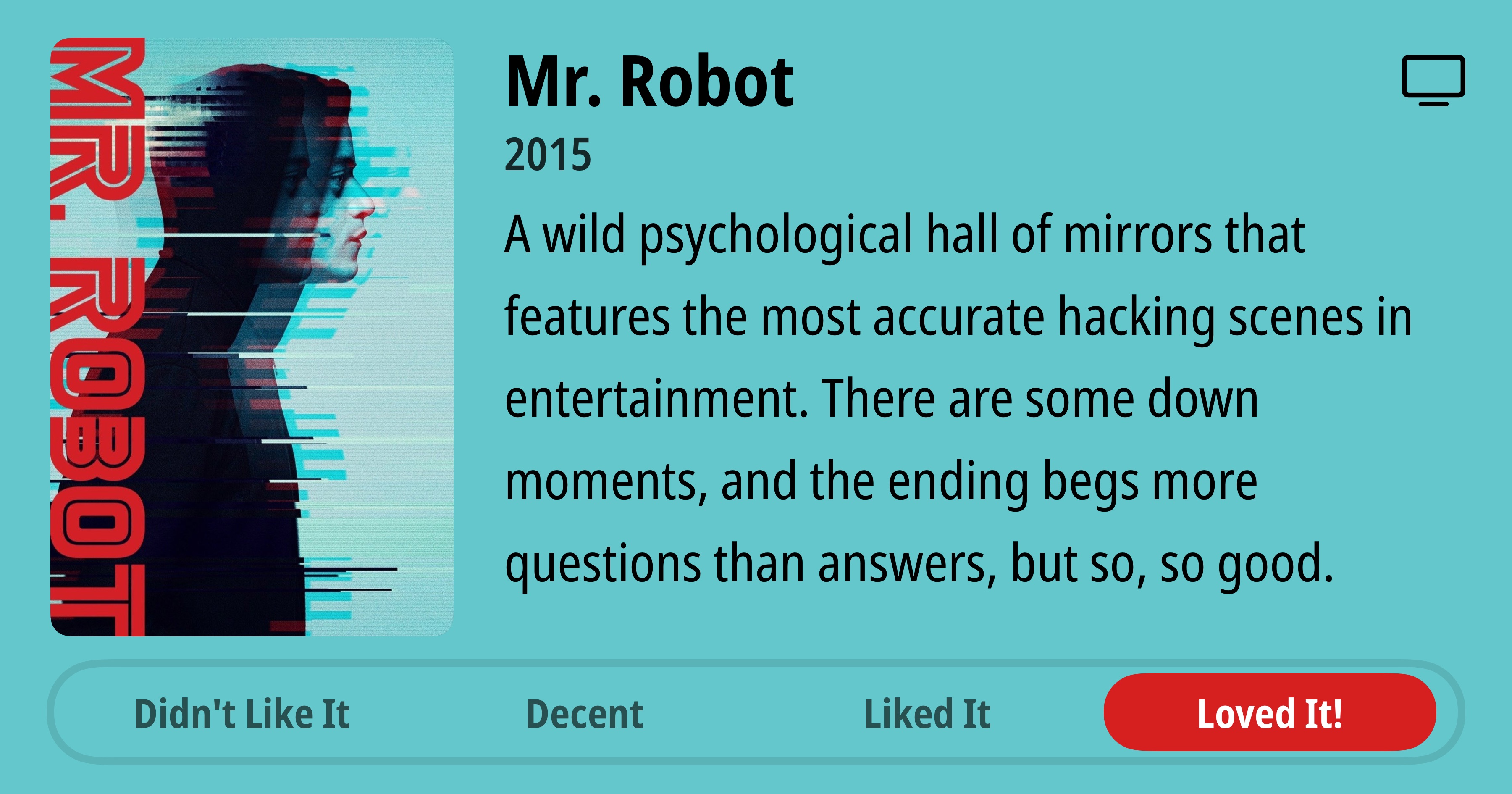 Mr. Robot • 2015 • A wild psychological hall of mirrors that features the most accurate hacking scenes in entertainment. There are some down moments, and the ending begs more questions than answers, but so, so good. • Loved It!