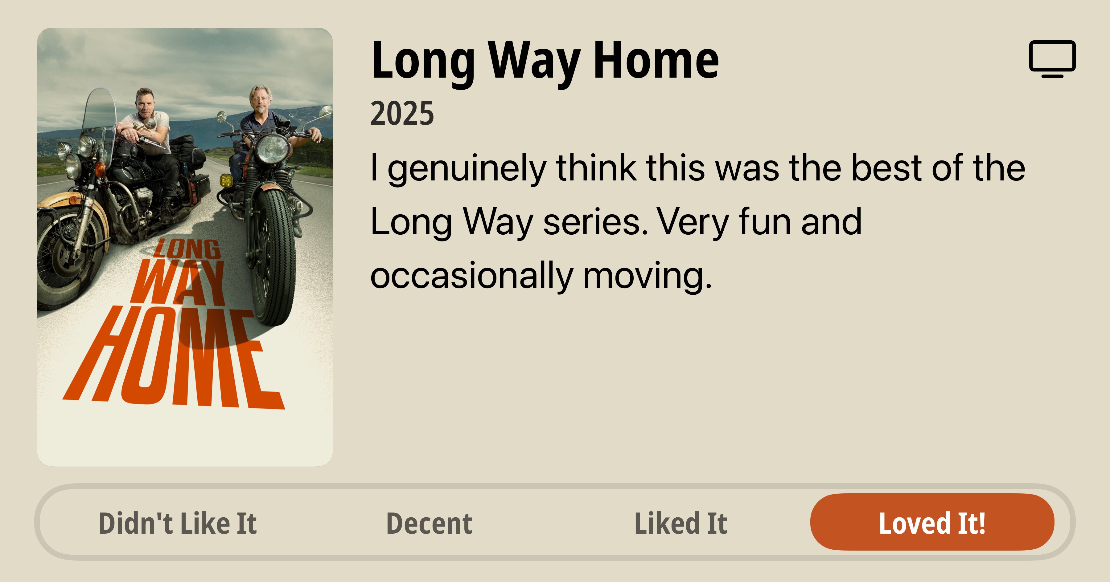 Long Way Home • 2025 • I genuinely think this was the best of the Long Way series. Very fun and occasionally moving. • Loved It!