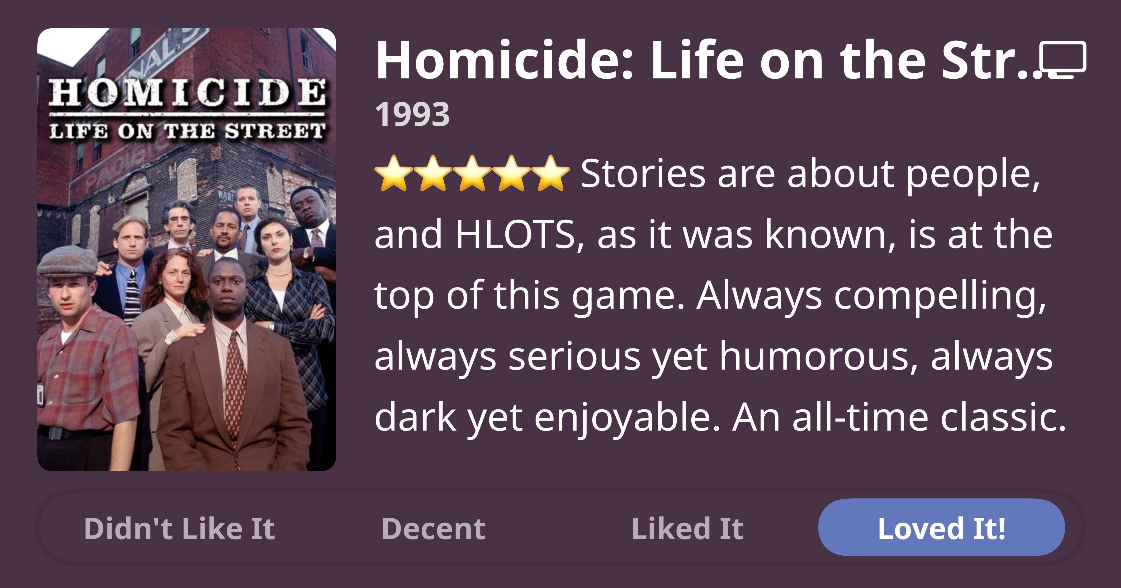 Homicide: Life on the Street • 1993 • Stories are about people, and HLOTS, as it was known, is at the top of this game. Always compelling, always serious yet humorous, always dark yet enjoyable. An all-time classic. • Loved It!