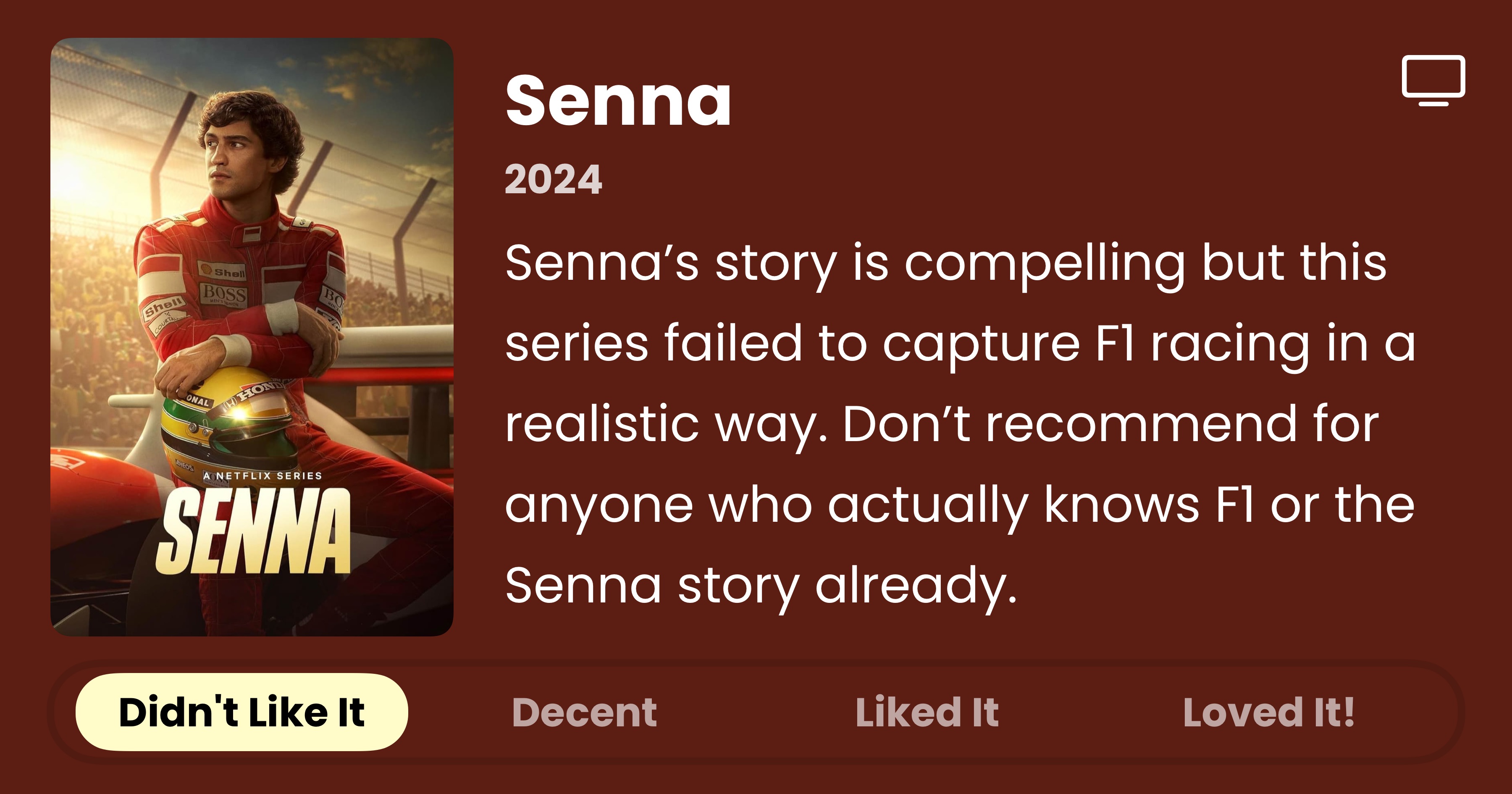 Senna • 2024 • Senna's story is compelling but this series failed to capture Fl racing in a realistic way. Don't recommend for anyone who actually knows Fl or the Senna story already. • Didn't Like It