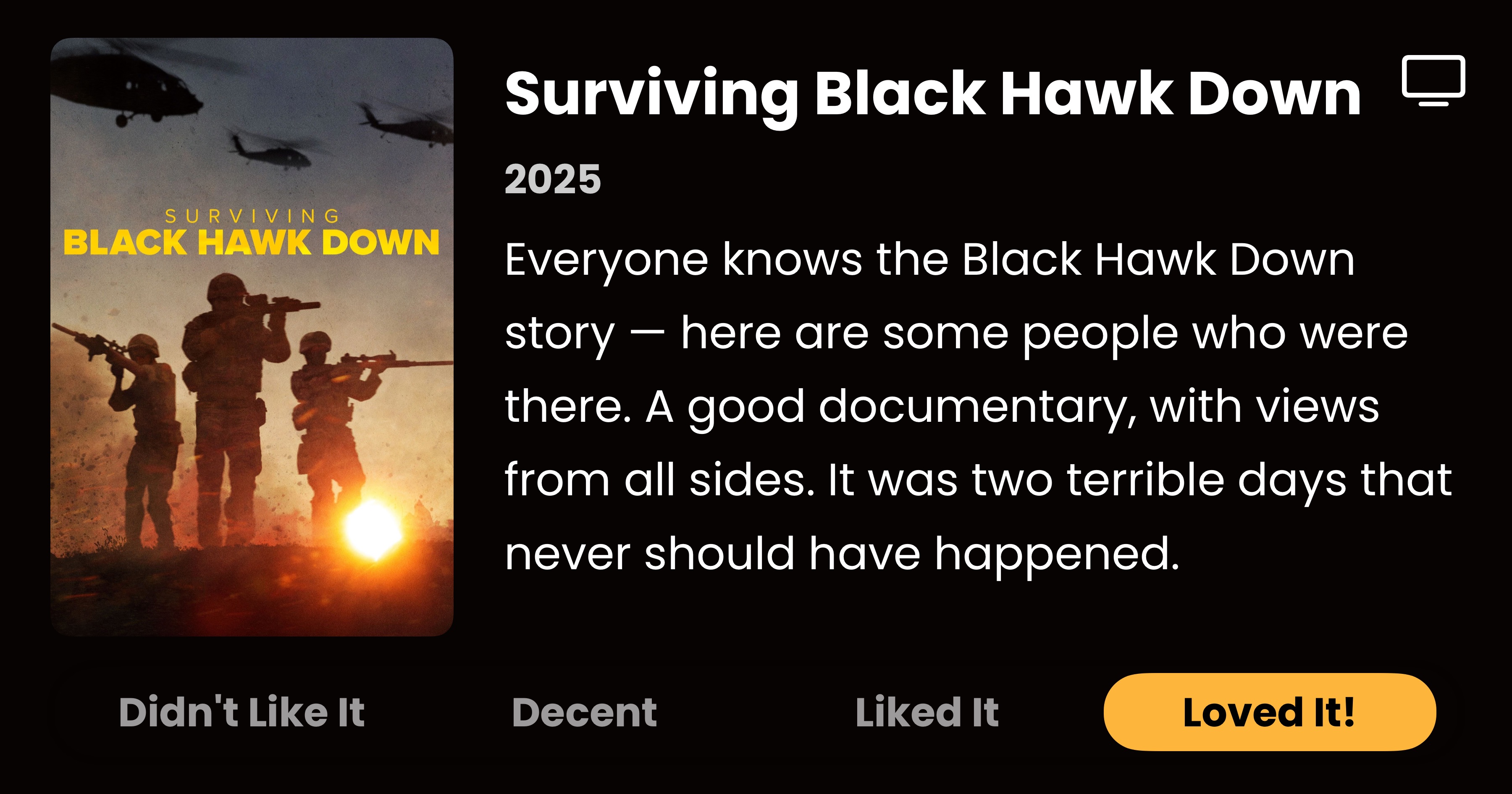 Surviving Black Hawk Down • Everyone knows the Black Hawk Down story - here are some people who were there. A good documentary, with views from all sides. It was two terrible days that never should have happened. • Loved It!