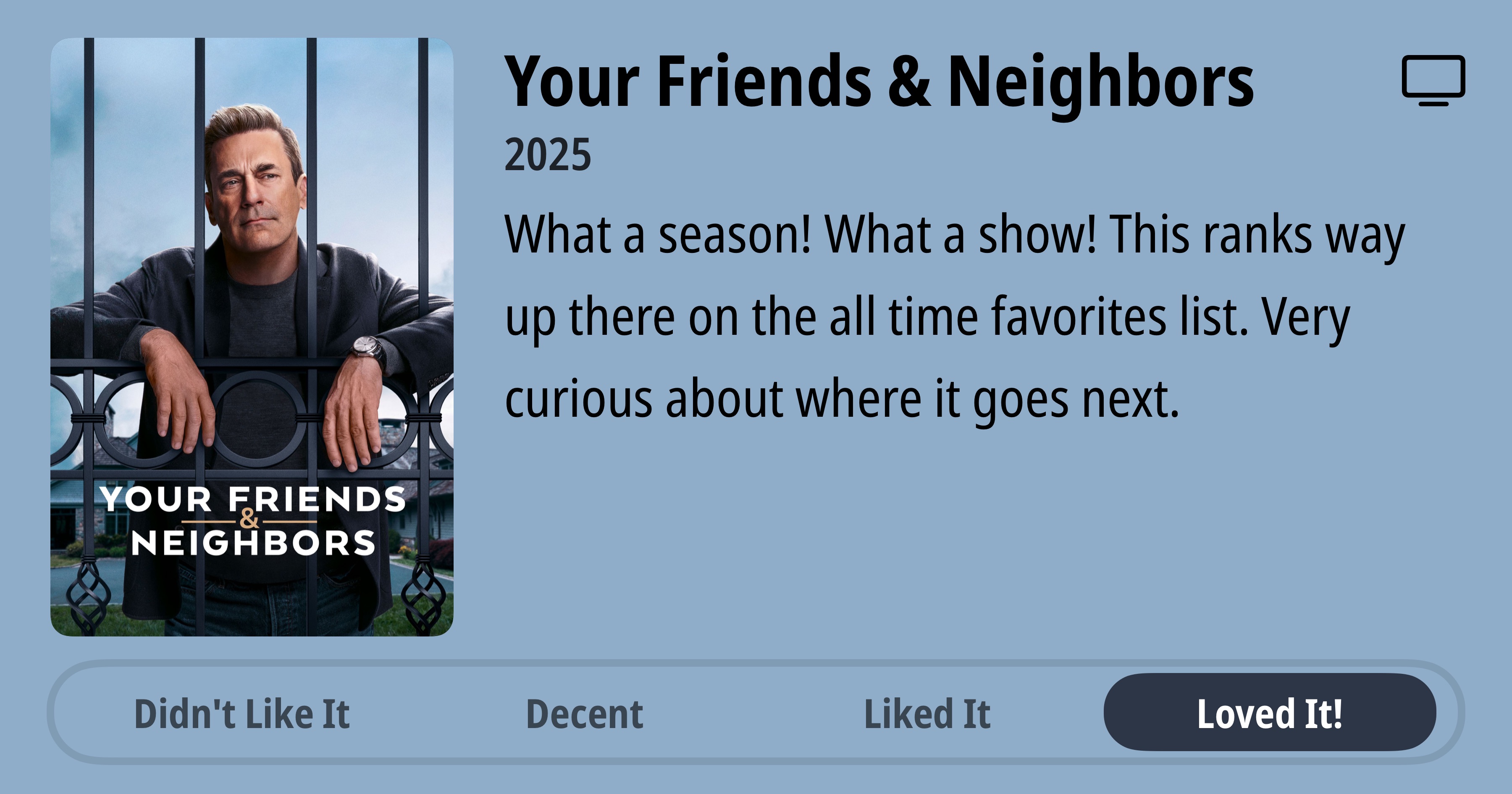 Your Friends & Neighbors • 2025 • What a season! What a show! This ranks way up there on the all time favorites list. Very curious about where it goes next. • Loved It!