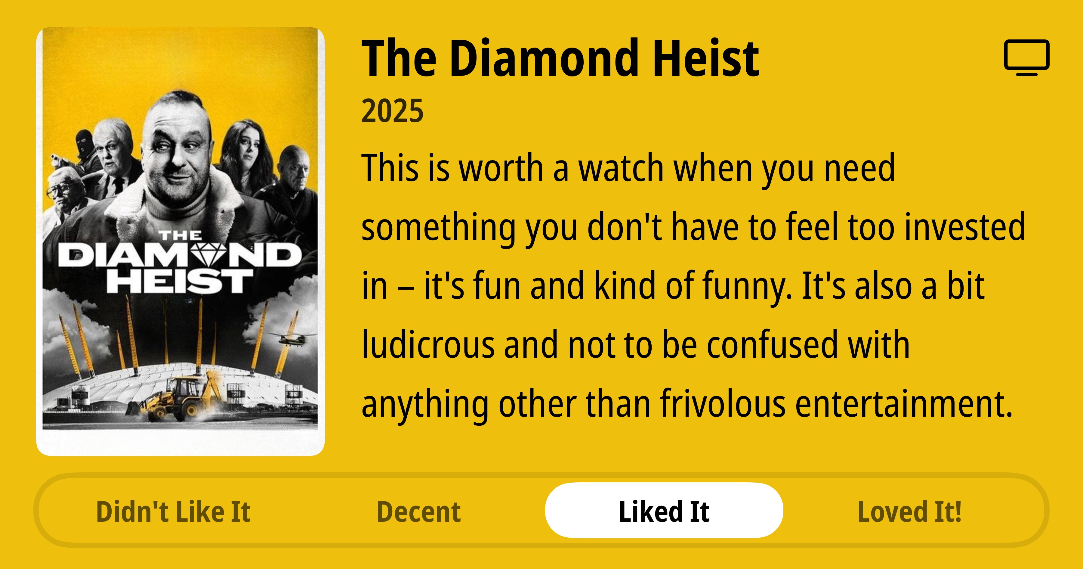 The Diamond Heist • 2025 • This is worth a watch when you need something you don't have to feel too invested in - it's fun and kind of funny. It's also a bit ludicrous and not to be confused with anything other than frivolous entertainment. • Liked It