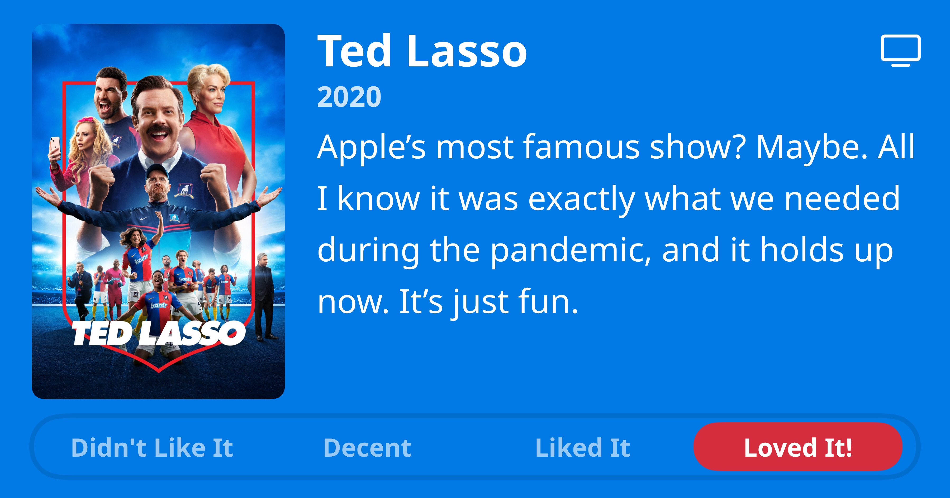 Ted Lasso • 2020 • Apple's most famous show? Maybe. All I know it was exactly what we needed during the pandemic, and it holds up now. It's just fun. • Loved It!