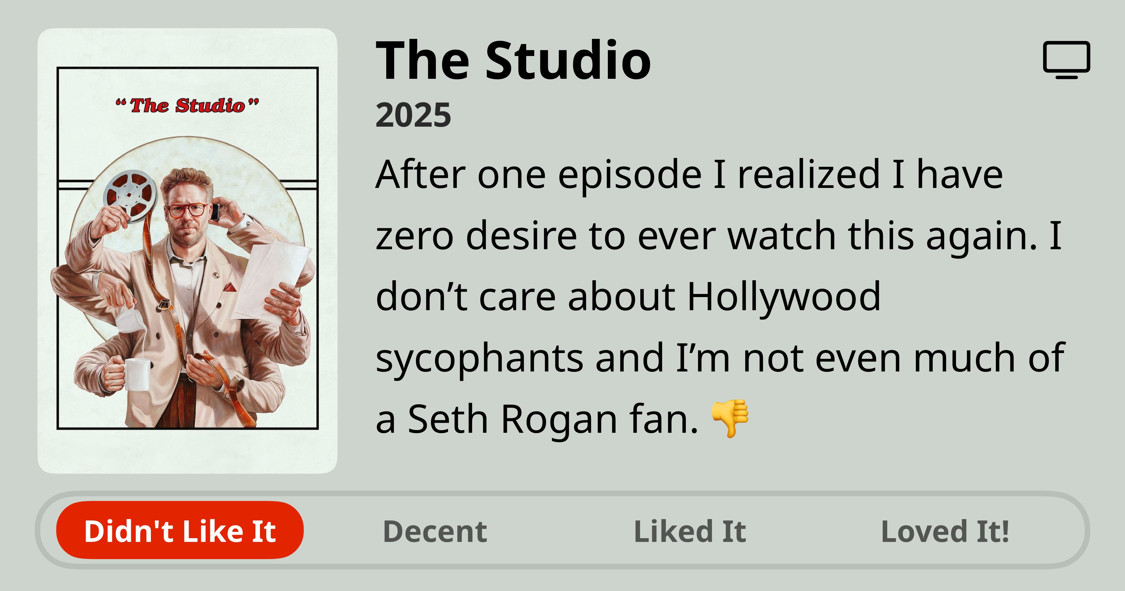The Studio • 2025 • After one episode I realized I have zero desire to ever watch this again. I don't care about Hollywood sycophants and I'm not even much of a Seth Rogan fan. • Didn't Like It