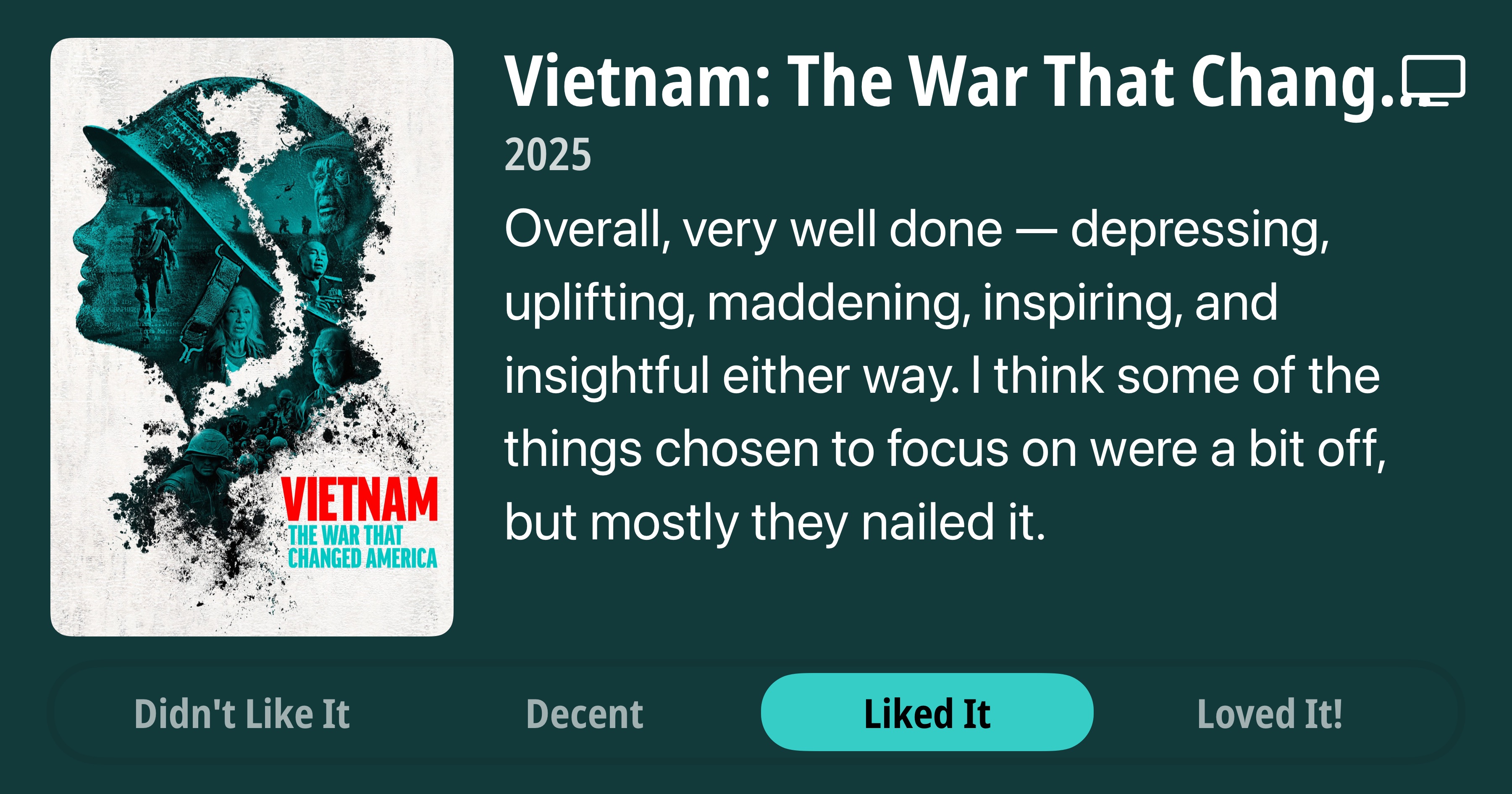 Vietnam: The War That Changed America • 2025 • Overall, very well done - depressing, uplifting, maddening, inspiring, and insightful either way. I think some of the things chosen to focus on were a bit off, but mostly they nailed it. • Liked It