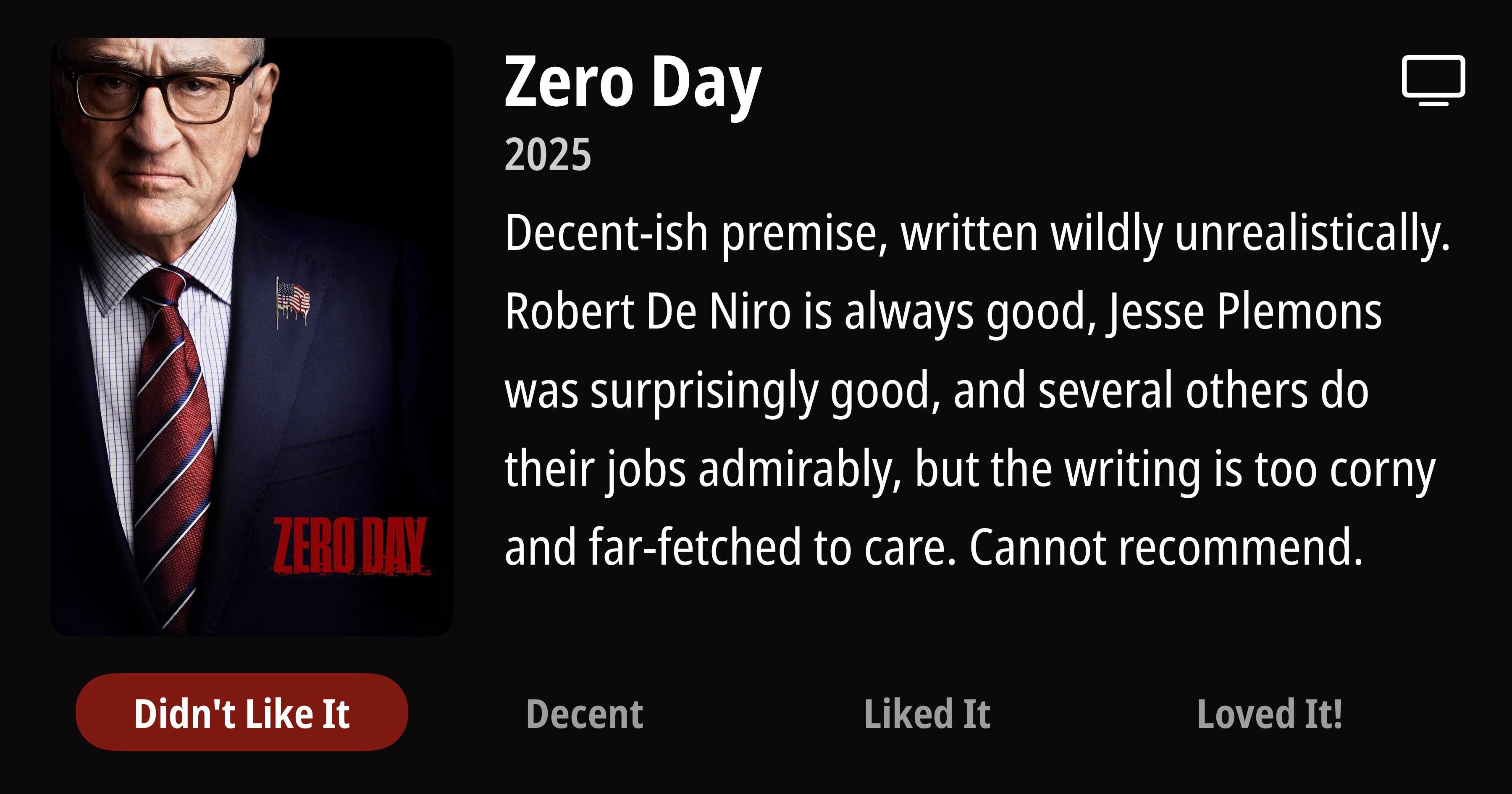 Zero Day • 2025 • Decent-ish premise, written wildly unrealistically. Robert De Niro is always good, Jesse Plemons was surprisingly good, and several others do their jobs admirably, but the writing is too corny and far-fetched to care. Cannot recommend. • Didn't Like It