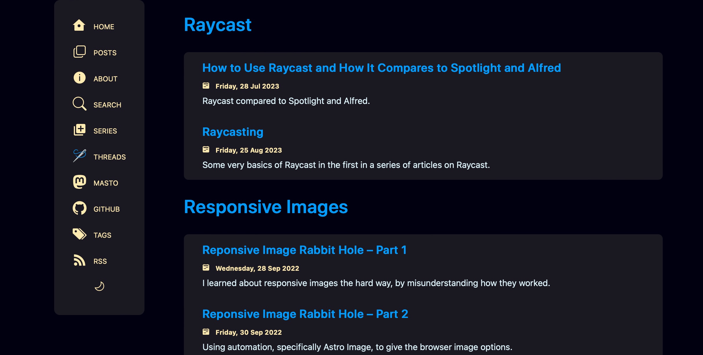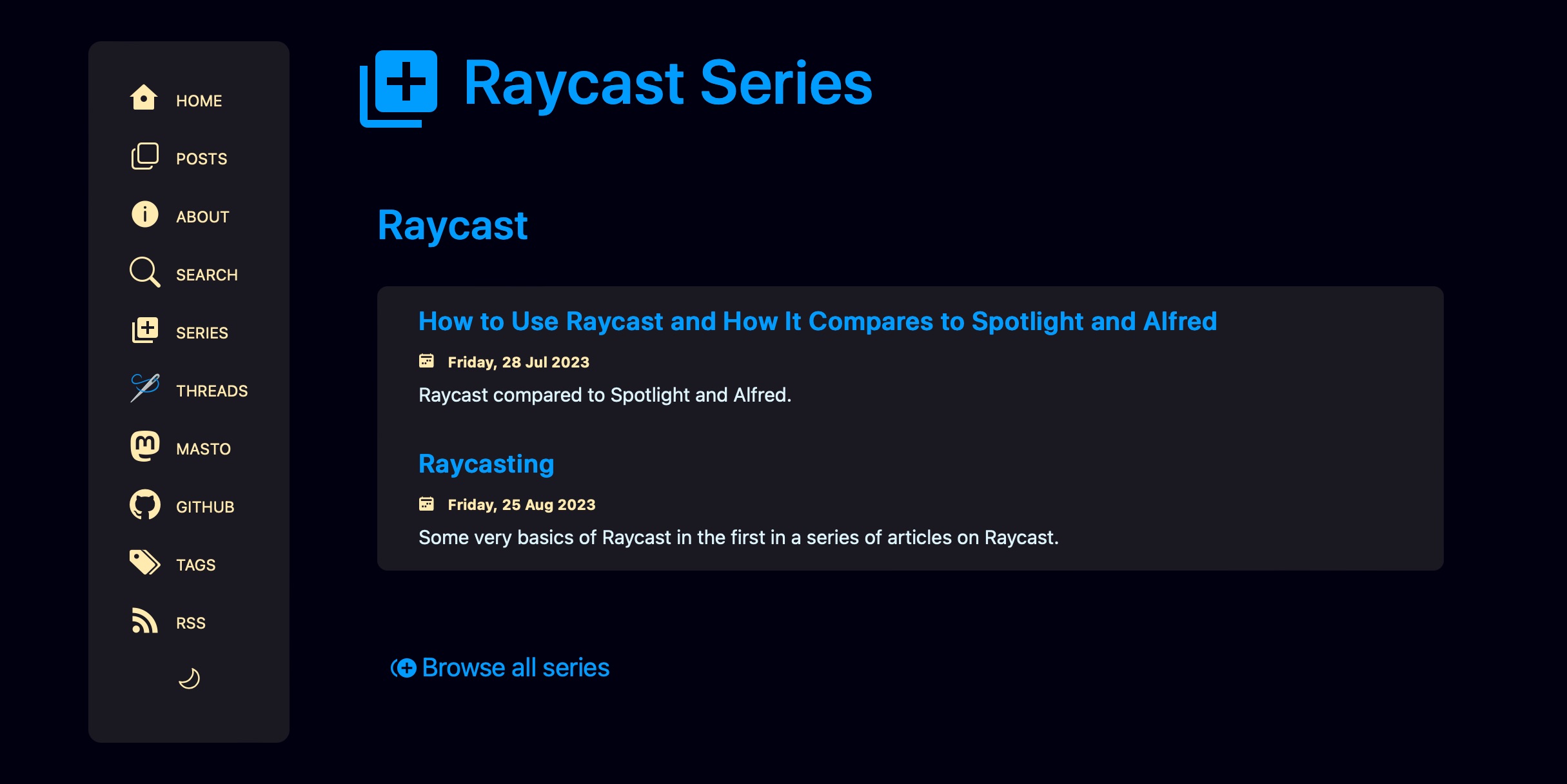 As I started yet another topic series in my last post about Raycast, I realized there was not a good way on this site to see topically related posts. I decided to remedy this by creating a Series view.